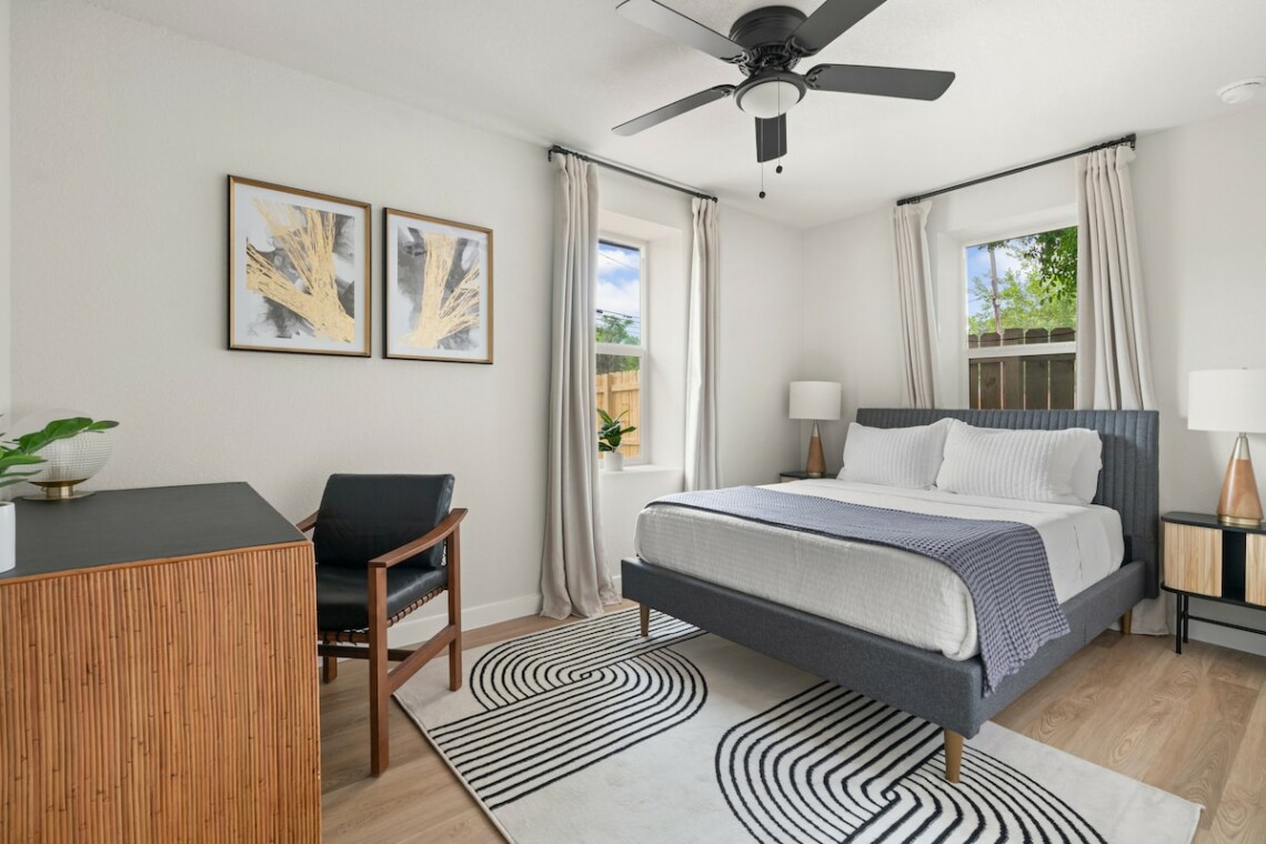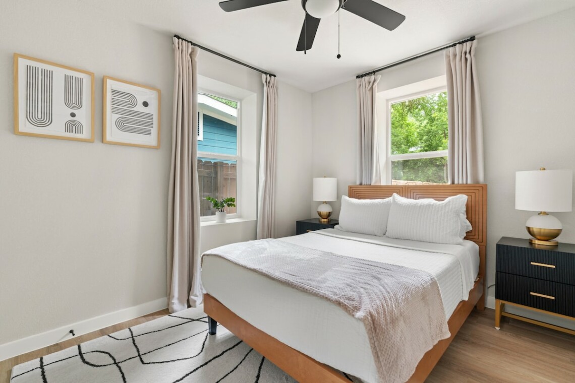 Welcome to your restful getaway, boasting two impeccably designed bedrooms and a modern, elegant bathroom that effortlessly blend comfort and style. With our vacation rental’s convenient location near downtown Austin, you can enjoy both the hustle and bustle of the city’s hotspots and the serene seclusion of a peaceful haven.