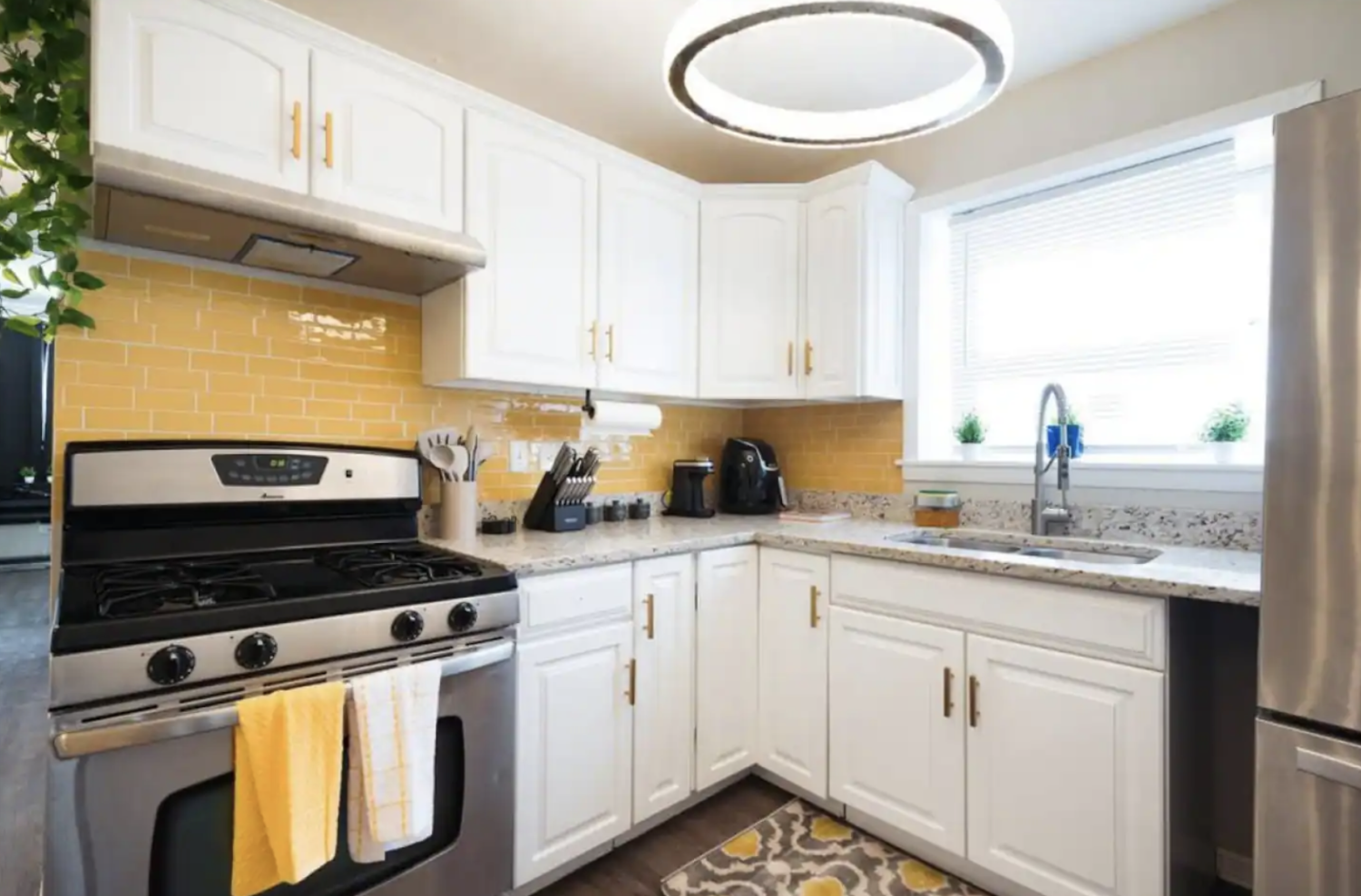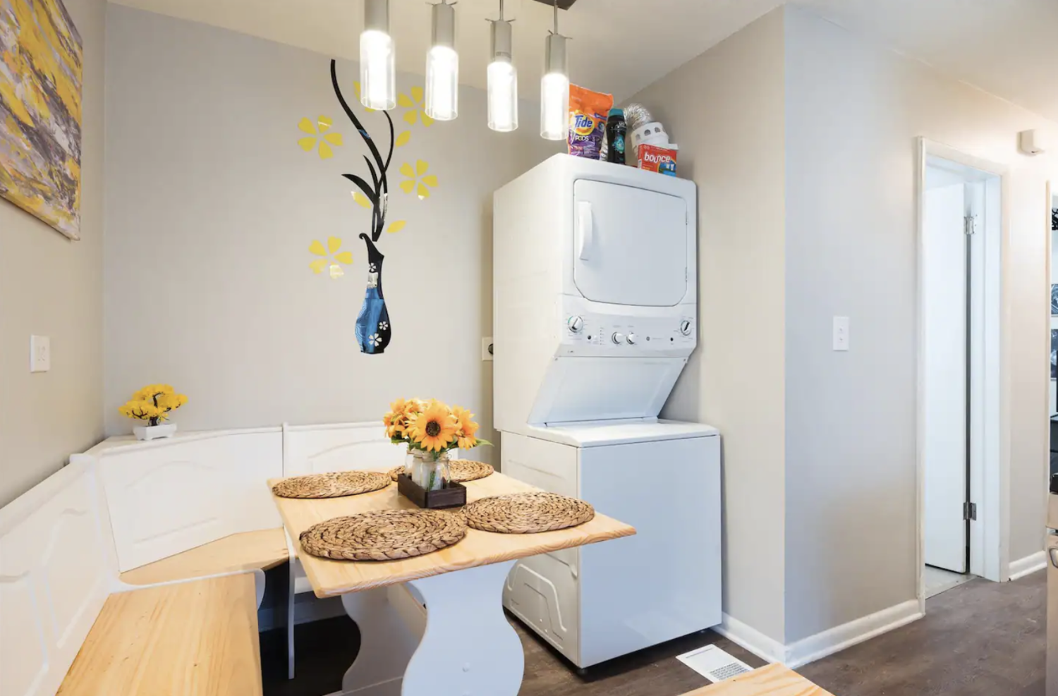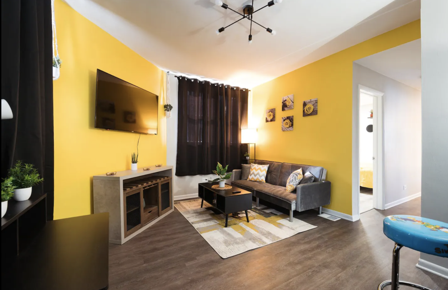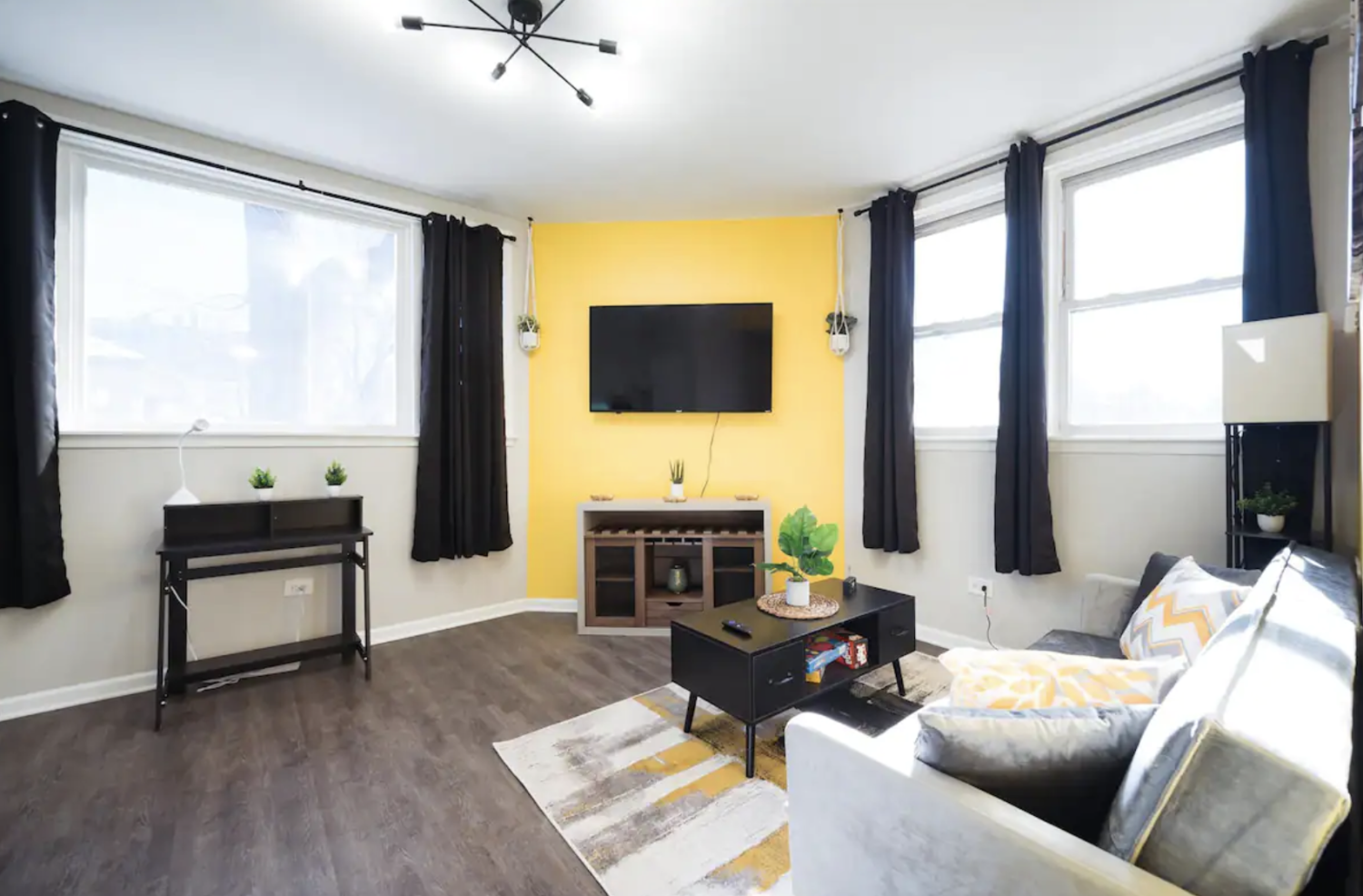 319. This cute and cheerful Chicago apartment features two elegantly decorated bedrooms and additional sleeping areas. The first bedroom has a queen-size bed, the second has a double bed, both with luxury bedding, stylish decor, new vinyl floors, and a Smart TV. The living room includes a desk/work area, sofas, and a queen-size inflatable mattress. The bright kitchen is equipped with all cooking essentials and a cozy table for meals or morning coffee. Perfect for a peaceful and enjoyable stay.