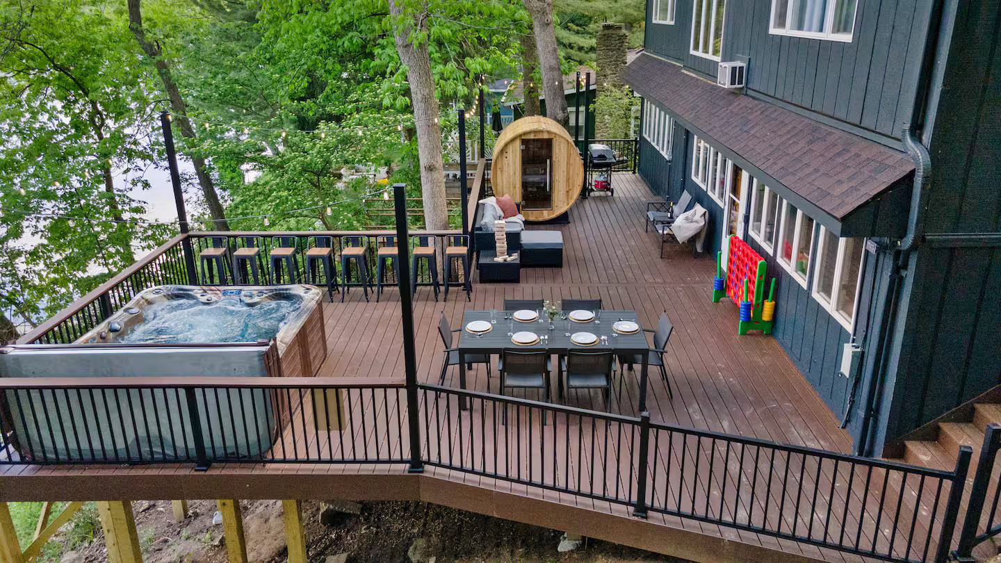 🔸Spacious deck - hot tub, sauna, fire pit, dining table, & lounge furniture