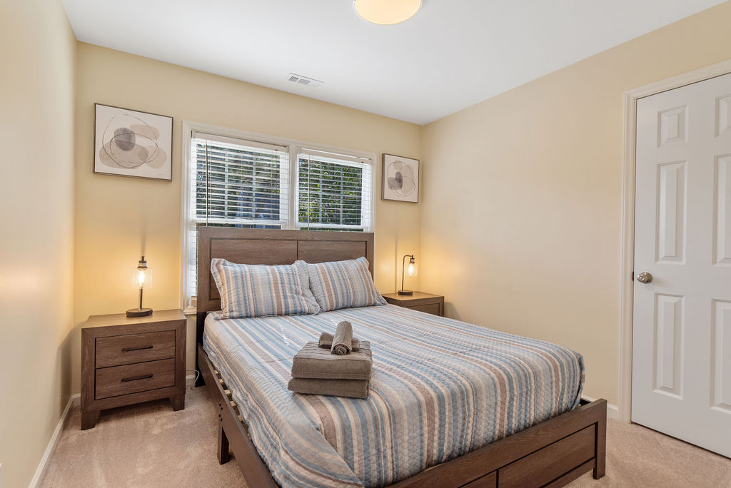 Upstairs, the primary suite includes a king bed, walk-in closet, and private ensuite bathroom with a soaking tub. Two additional bedrooms feature queen beds and are thoughtfully furnished for comfort and convenience.