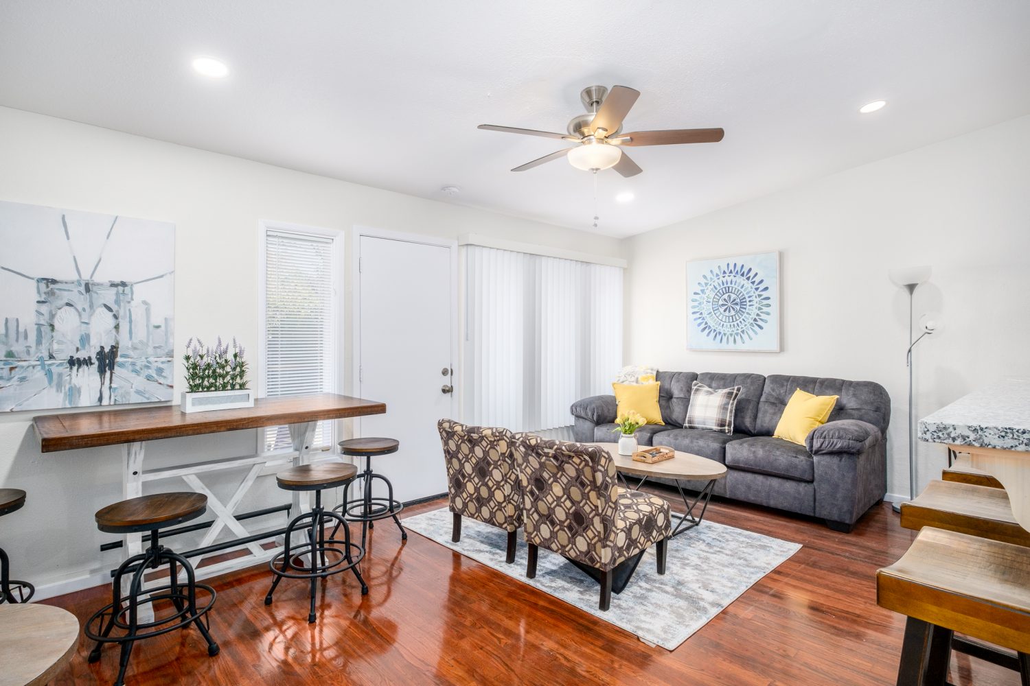 962 sf 3 bedroom 1 bath. Highly rated by Airbnb. All hardwood flooring and the front yard has a metal fence/gate. TV is in bedrooms on top of the living room.