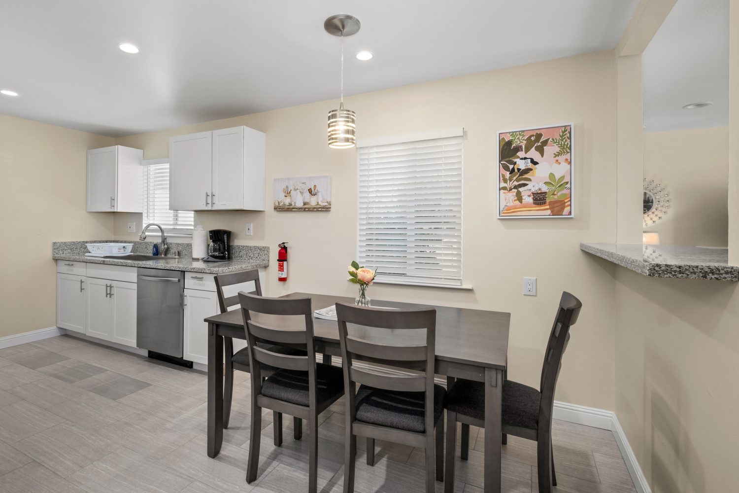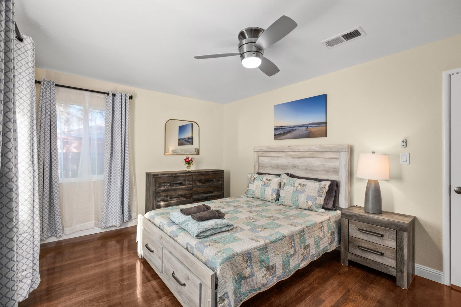 1,029 sf 3 bedroom 1 bath. Highly rated by Airbnb. All hardwood flooring and the front yard has a metal fence/gate. TV is in bedrooms on top of the living room.