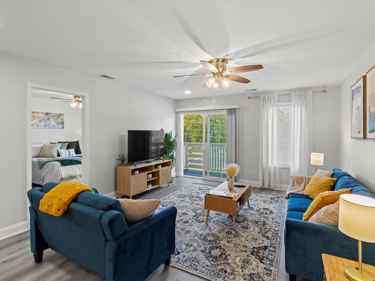 Enjoy direct access to the balcony right from your room. The second bedroom also offers a king-size bed, blackout curtains for restful sleep, a spacious closet, and its own workstation with a desk and monitor perfect for guests or colleagues. The guest bathroom includes a single vanity and a tub/shower combo, providing flexibility and comfort.