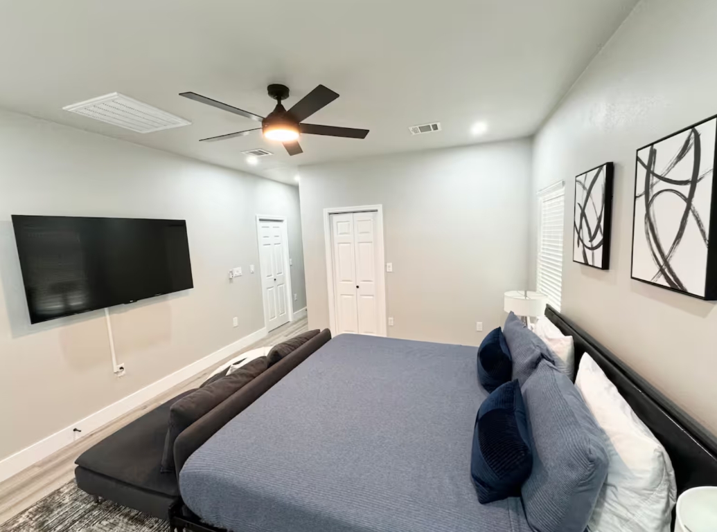 - Double closet with hangers, laundry basket, and storage bin for extra pillows/blanket