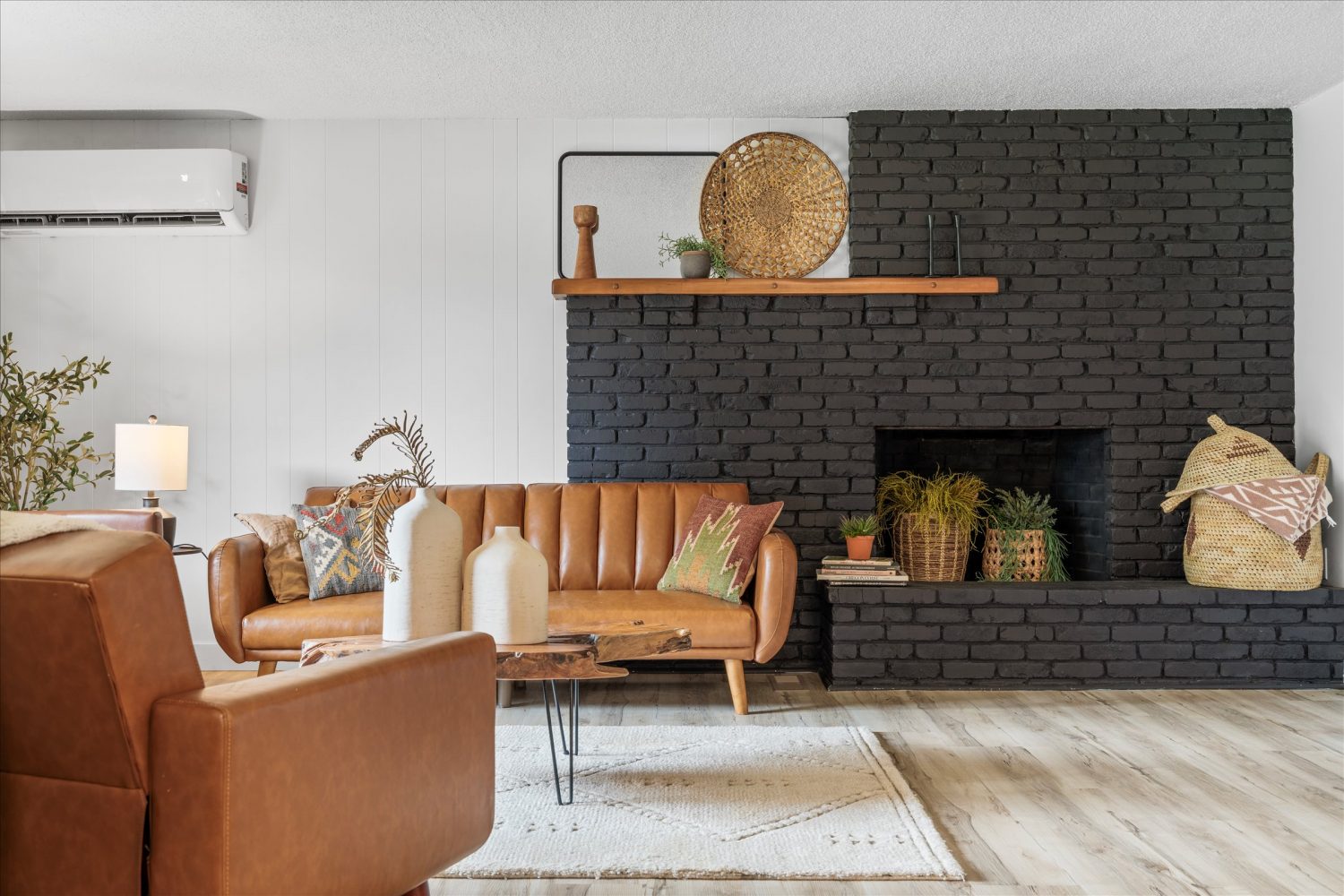 - Cozy Family Room Featuring a wood-burning mid-century fireplace