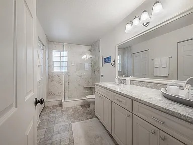 Three full bathrooms—including a spa-inspired primary ensuite with dual-sink quartz vanity and glass-enclosed shower.