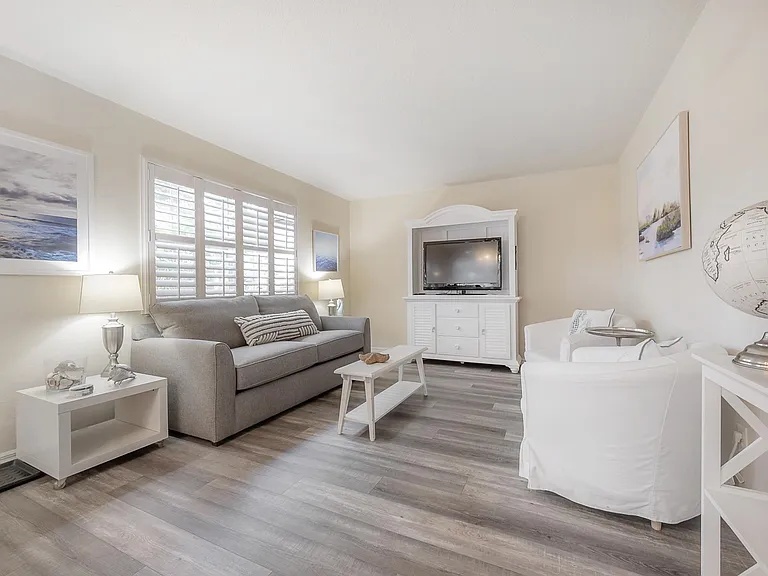 A bright, open floor-plan living area with faux-wood flooring, plantation shutters and neutral, welcoming décor.