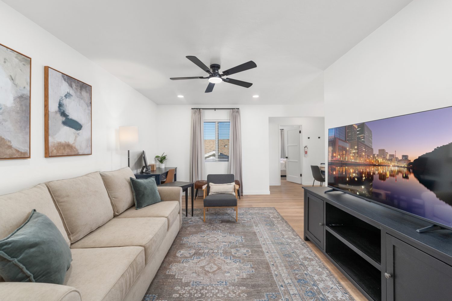 Enjoy a dedicated workspace with a desk and high-speed WiFi for uninterrupted productivity. The private 1-car garage and additional street parking make your stay stress-free, while the shared courtyard with firepit seating and string lights offers a cozy outdoor escape.
