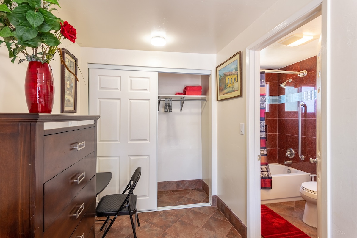 Each room in this 4-bedroom Imperial Beach house has a full-size closet and many drawers. It is fully equipped with all the essentials and amenities you would find in a hotel. Just bring your toothbrush! With the Red room, you get:- Private bathroom- Private parking space- Private entrance- 40-inch TV With the Blue room, you get:- Your own private bathroom- Your own parking space- 40-inch TVThe other two rooms share a bathroom Each room has a TV, closet, etc. The entire house has Wi-Fi access.