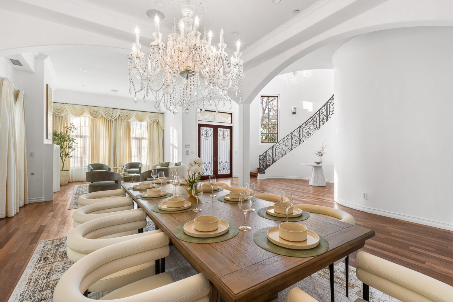 • Features a luxurious 10-seater dining set beneath an elegant chandelier for a refined dining experience.