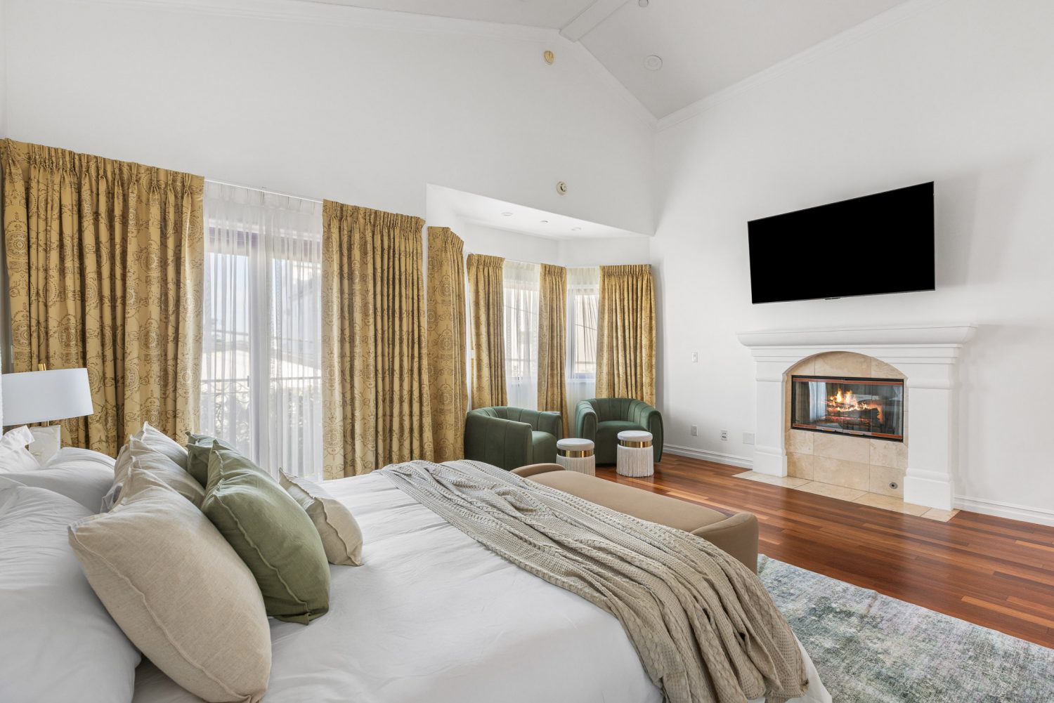 • Primary Bedroom: Features a king-size bed, walk-in closet, and a luxurious spa-like en-suite bathroom with a steam shower and deep freestanding soaking tub, frameless glass rainfall shower, and two vanities.