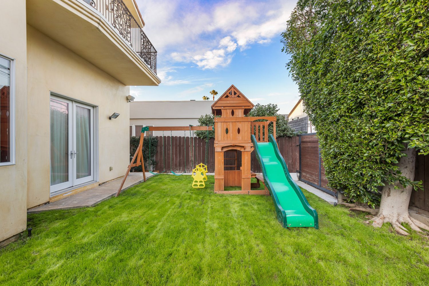 • Backyard & Playground: A fully fenced, secure sanctuary featuring a lush lawn and a multi-level playground set with swings, a slide, and a climbing wall.