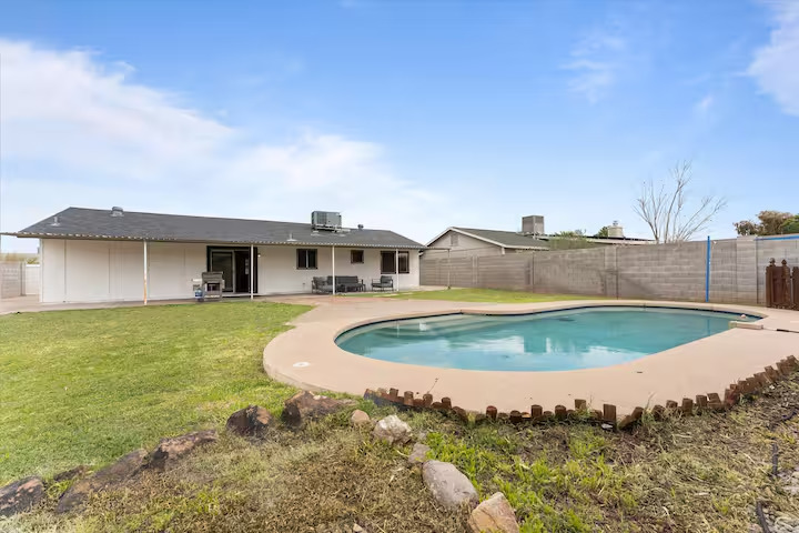 The spacious backyard is the perfect oasis, featuring a sparkling pool for those hot Arizona days. Enjoy outdoor dining and lounging on the patio while soaking in the sunshine.