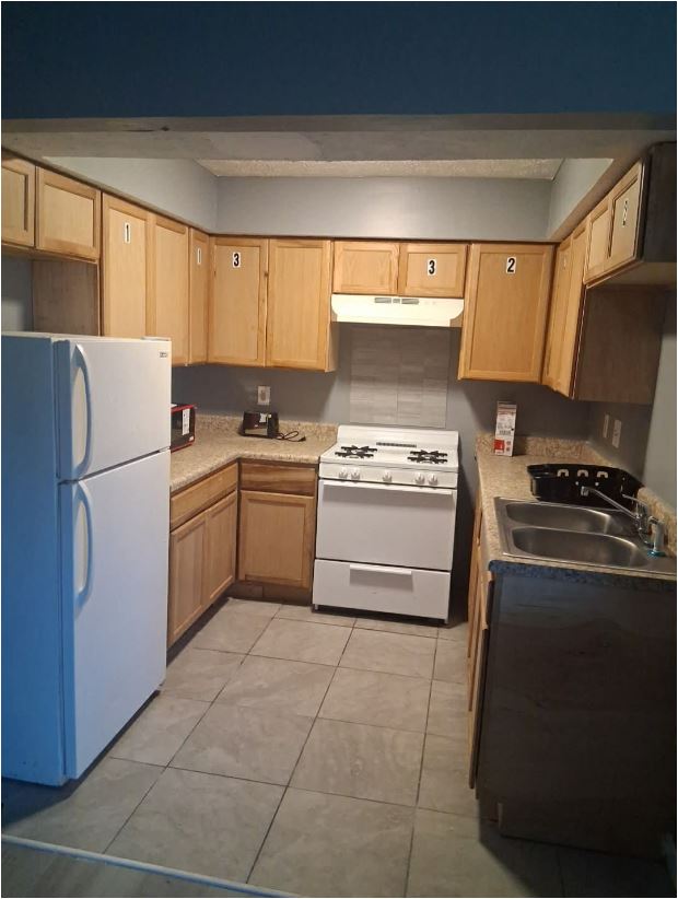 Cabinets are numbered by bedroom and have locks so tenants can securely store food and personal kitchen items