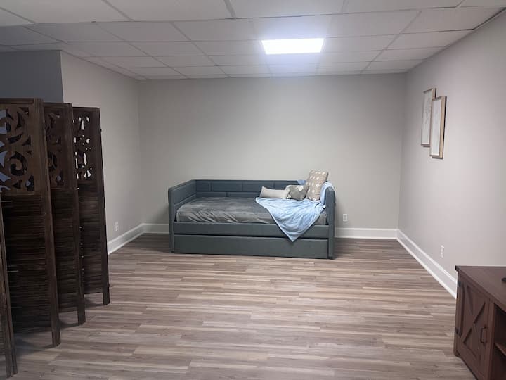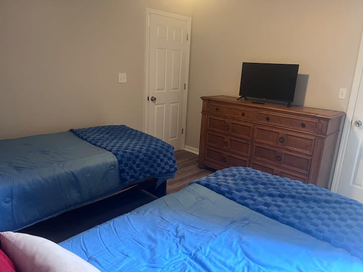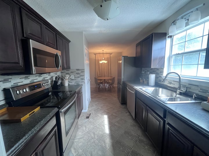 Enjoy a cozy, freshly updated home perfect for families, groups, or business travelers. Relax by the fireplace, cook in the fully equipped kitchen, and unwind in four comfortable bedrooms—queen master, 2 twin rooms, and lower suite with queen + sleeper daybed. Fast Wi-Fi, Smart TVs, laundry, free parking, and minutes to top shops, dining, and attractions!