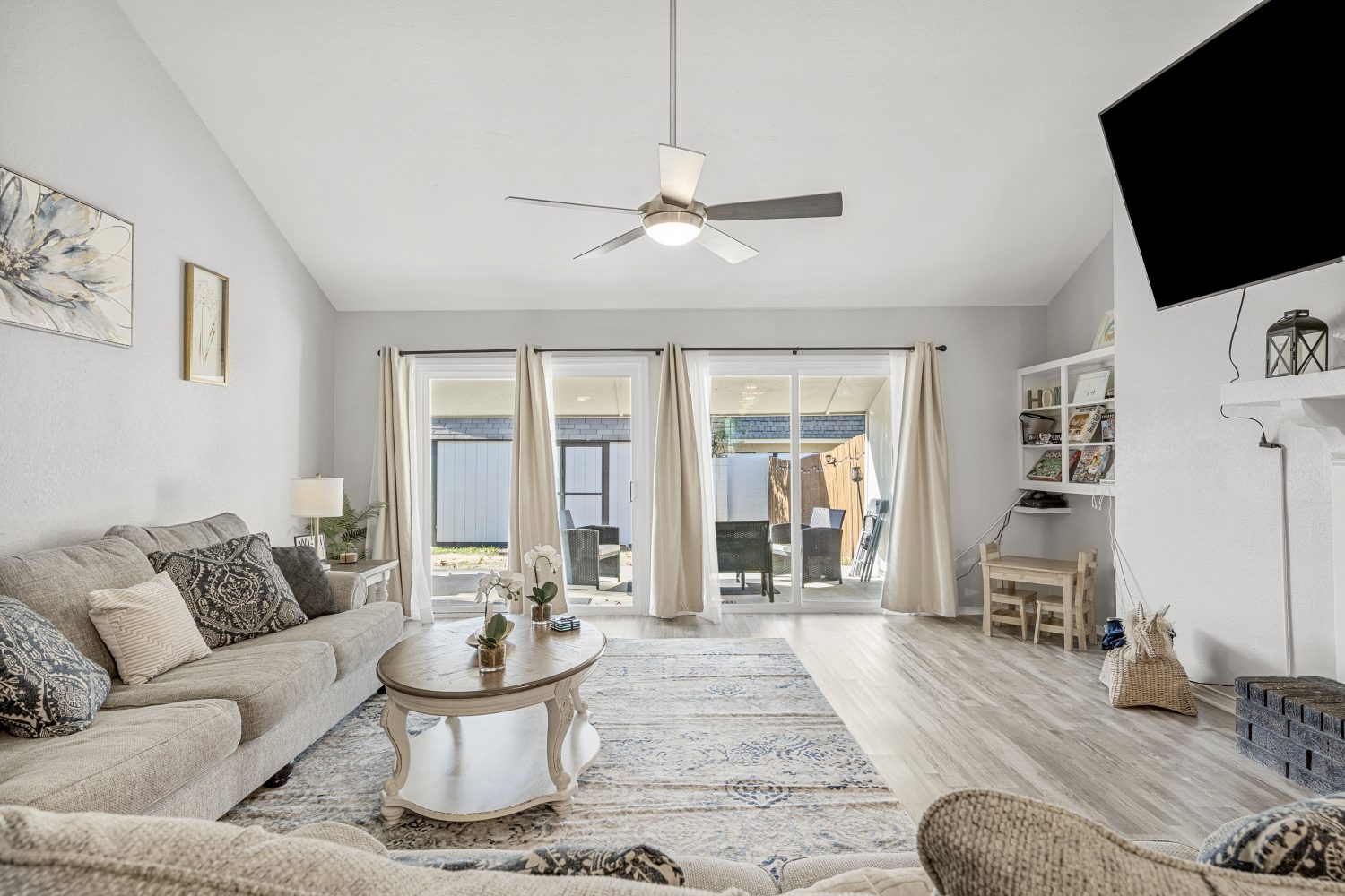 * Private fenced backyard with patio, seating, and outdoor area