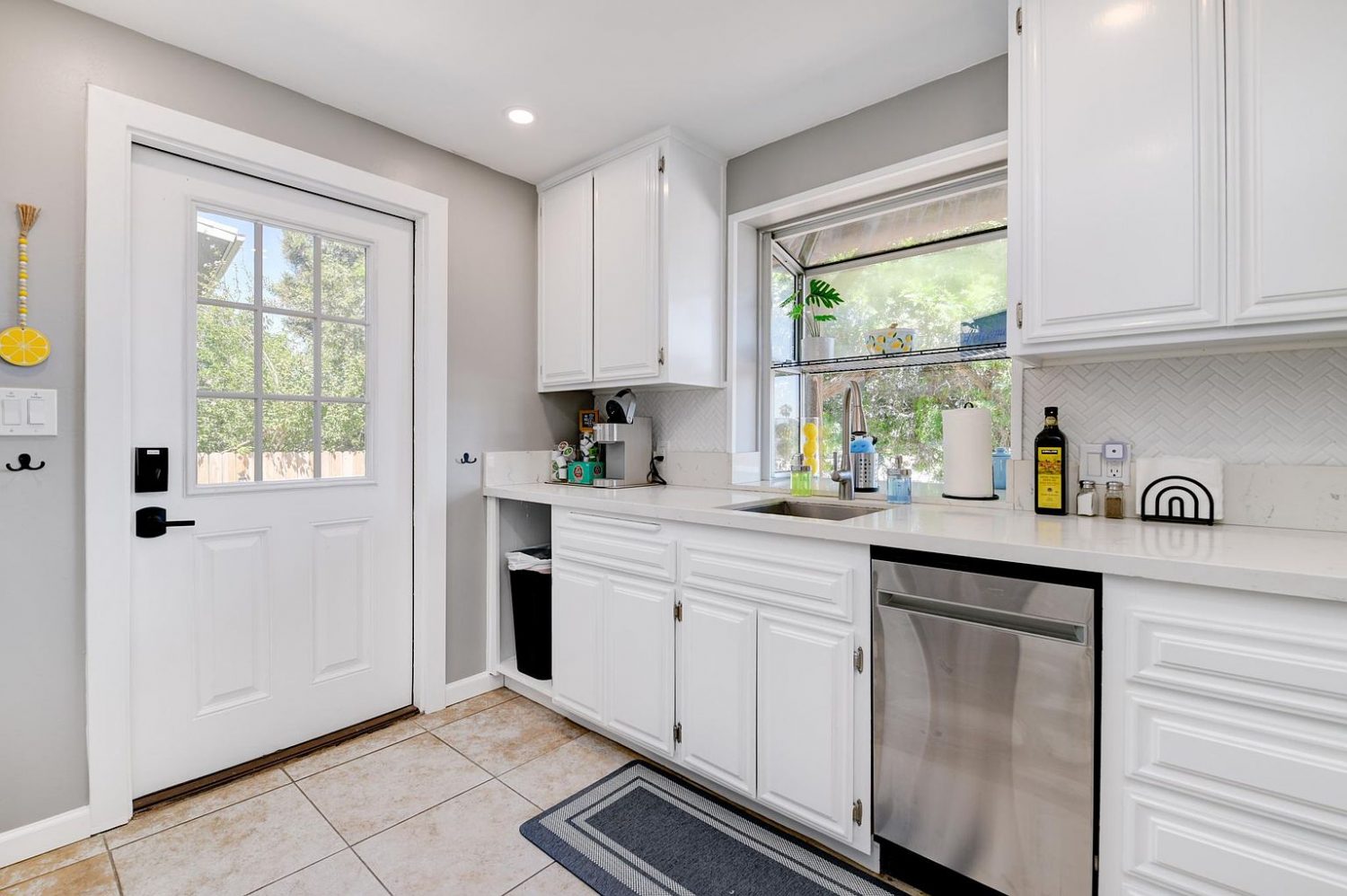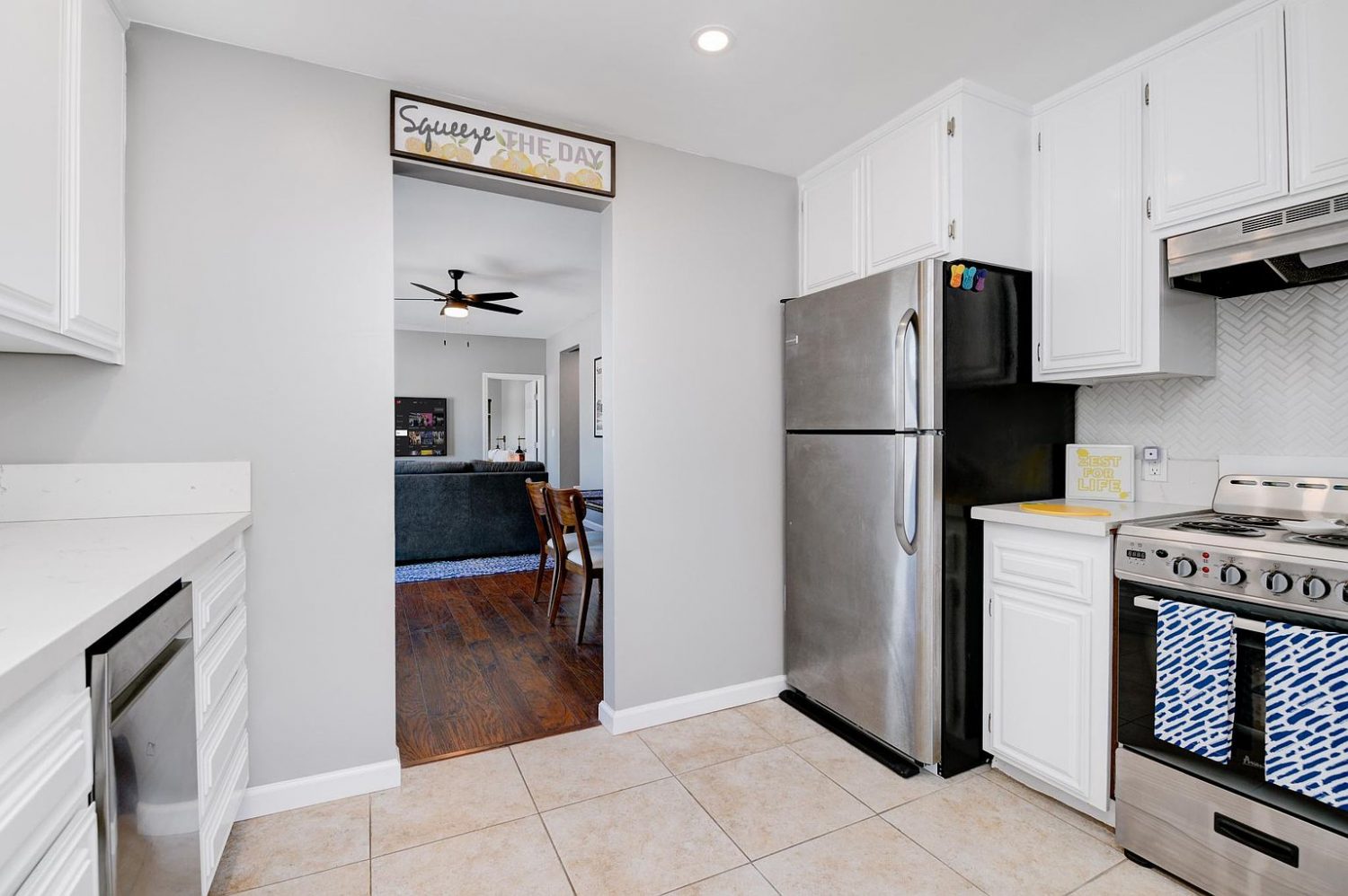 Decor: Stylish, inviting decor featuring yellow, blue, grey, and wood accents to create a bright and lively home-away-from-home ambiance.