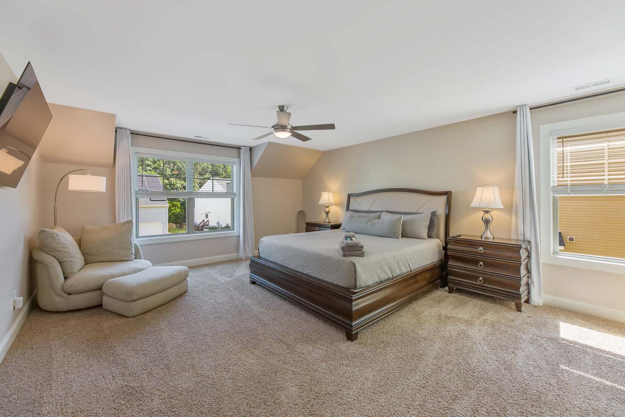 After a long day, retreat to the primary suite, complete with a king bed, plush linens, and an ensuite bathroom featuring dual vanities and modern fixtures.