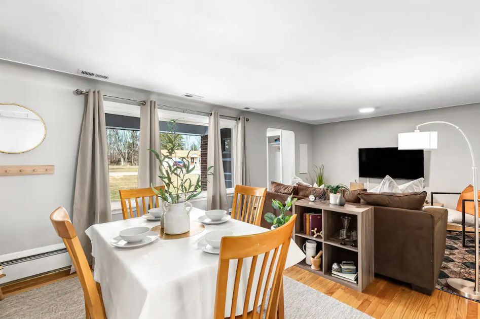 The home is a unique, attractive brick duplex located in a quiet, residential neighborhood, located in one of the oldest streets in Shelby Township. This home has 2 entrances in the front. Each side of the home connect in the laundry room in the back, but share doors for privacy. This home is ideal for large groups who wish to stay together, but value their own privacy.