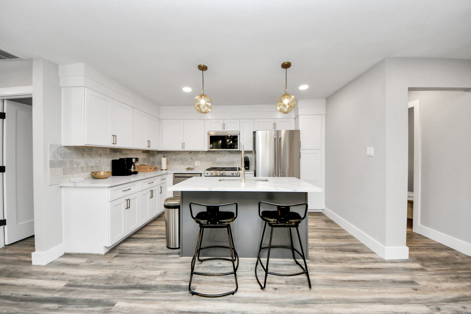 A modern, fully equipped kitchen designed for culinary enthusiasts, featuring quartz countertops and updated stainless steel appliances.