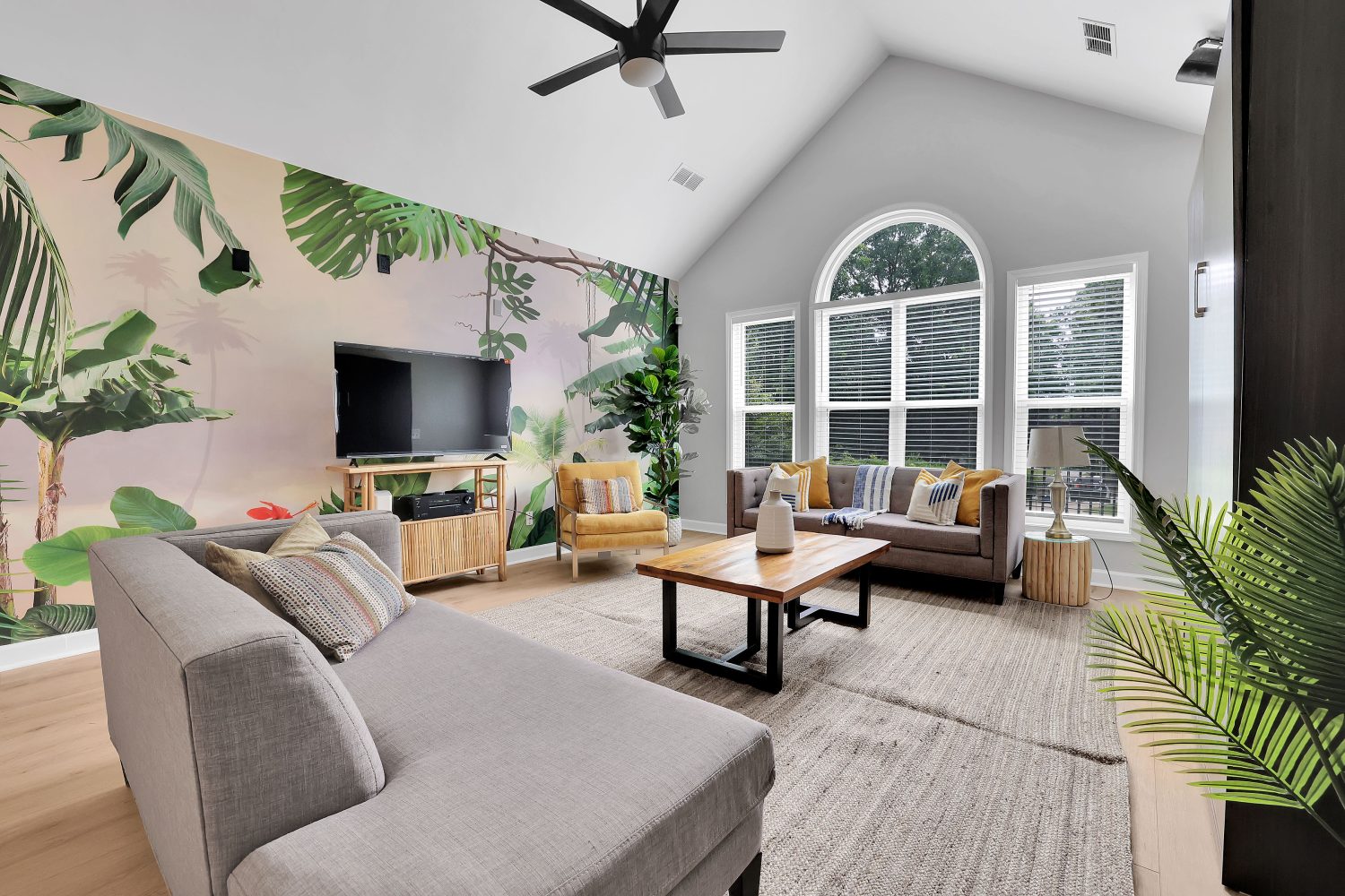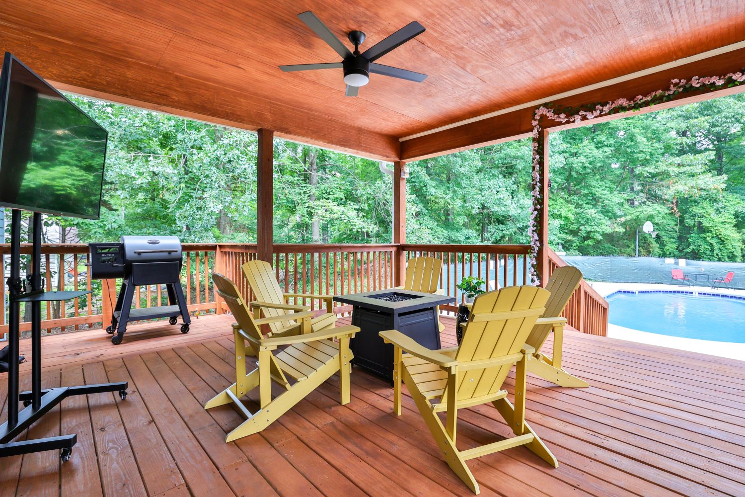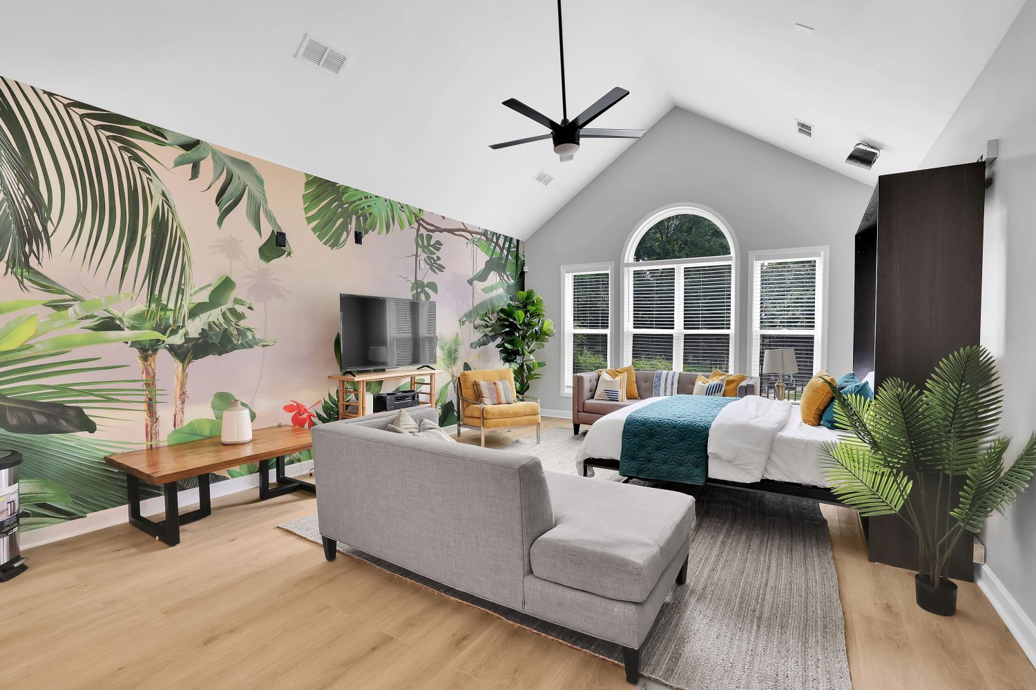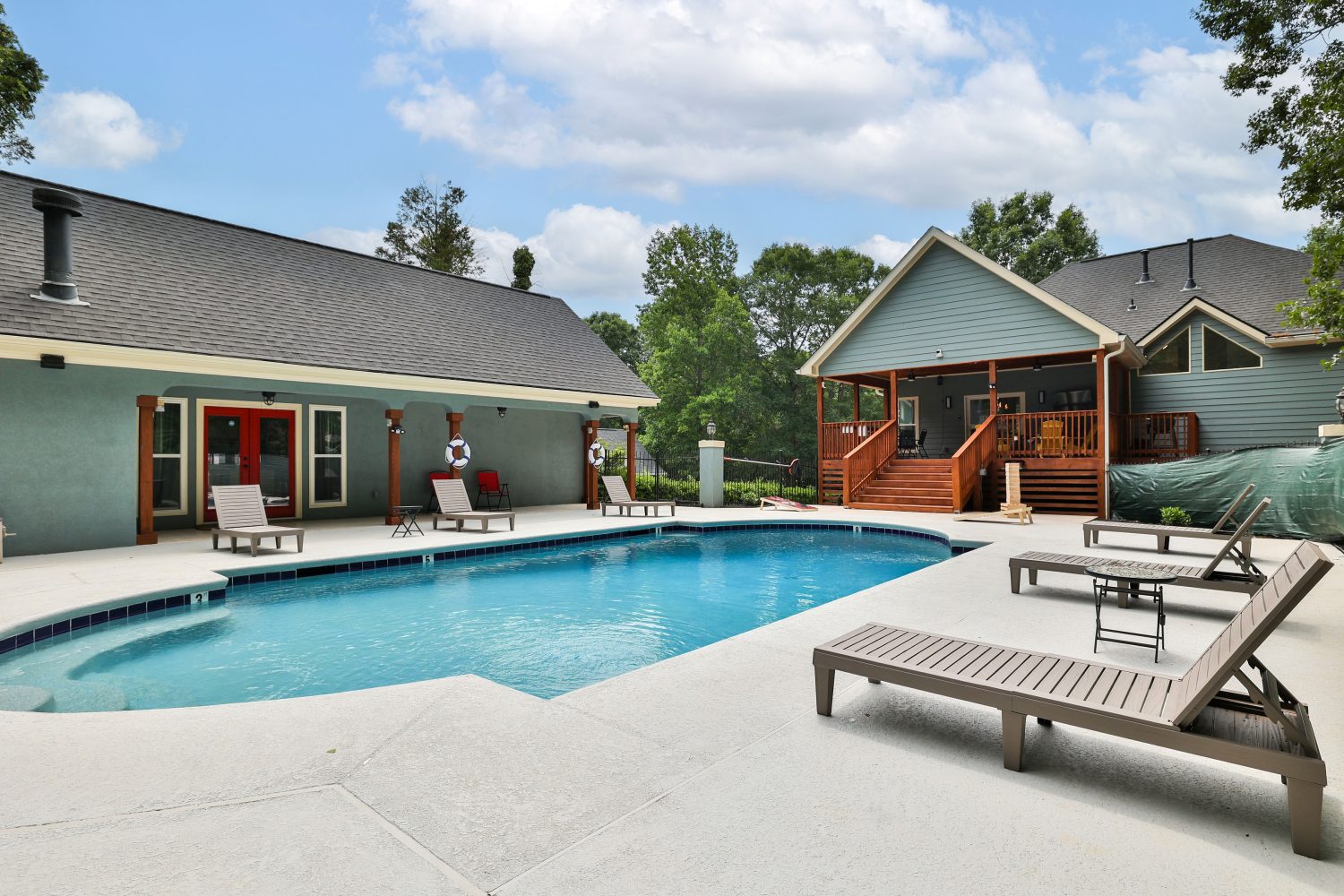 This is a beautifully decorated home with a pool and a pool house. It has a full kitchen, towels, and all the necessities for day-to-day life.