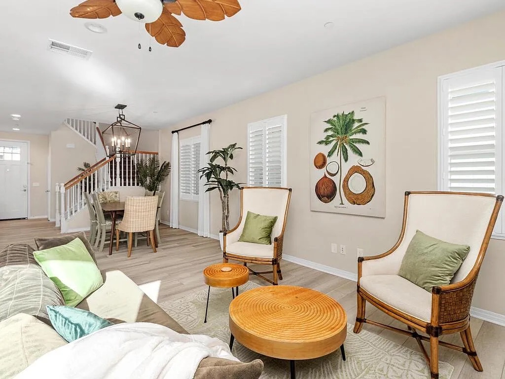 Built in 2019 and fully furnished, this 4 bedroom, 4 bathroom suburban home has all you need (including bathroom and kitchen essentials) for a vacation or for temporary relocation. This home is just a short drive to The San Diego Zoo, SeaWorld, The Del Mar Fairgrounds and Raceway, Downtown San Diego, and lots of other shopping and dining options. The large chef's kitchen is fully equipped with top-of-the-line appliances, 4 barstools and a 6-seat dining room table that makes serving meals a breeze. After meals the family can flow effortlessly into the luxurious backyard, which features an outdoor dining area and a BBQ. One bedroom and full bathroom is on the main level; the other rooms are located on the upper level ,which is perfect for getting everyone ready for bedtime. The attached garage fits 2 cars, the oversized driveway fits 2 more, and there is available street parking in the quiet cul-de-sac. This is the perfect hub for a family looking to take a break from the hustle and bustle or for temporary relocation. Let us help make your San Diego vacation one to remember!