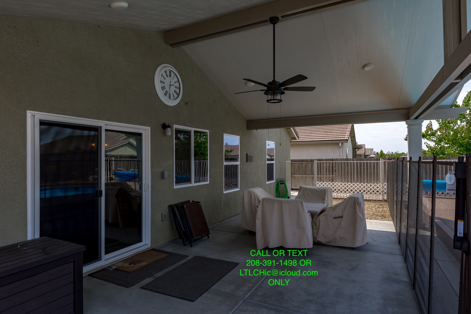 Emphasizing water conservation, the property showcases low-maintenance dryscape landscaping in the front and backyards, with an automatic drip system in the front. An expansive covered patio leads to a refreshing pool for guests to enjoy during warm weather. Furthermore, a designated dog run area with a covered patio and comfortable dog house is available for approved dog.