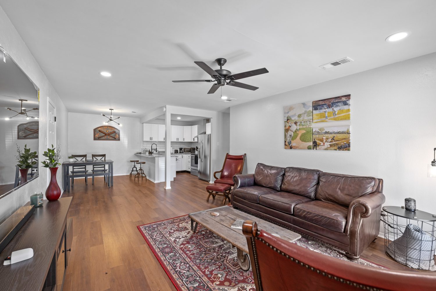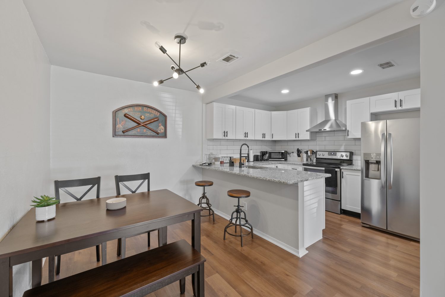 Welcome home to this charming first-floor unit nestled in a quaint single-story fourplex. This freshly remodeled 2 bedroom 1 bath unit has an open living room, dining room, and kitchen. Relax and watch the game or favorite TV show on the 75" living room TV. The larger bedroom has a king size bed with TV and desk. The smaller room has a bunk bed with full size mattresses. Kitchen is equipped with stainless steel appliances. Comfortably sleeps up to 7