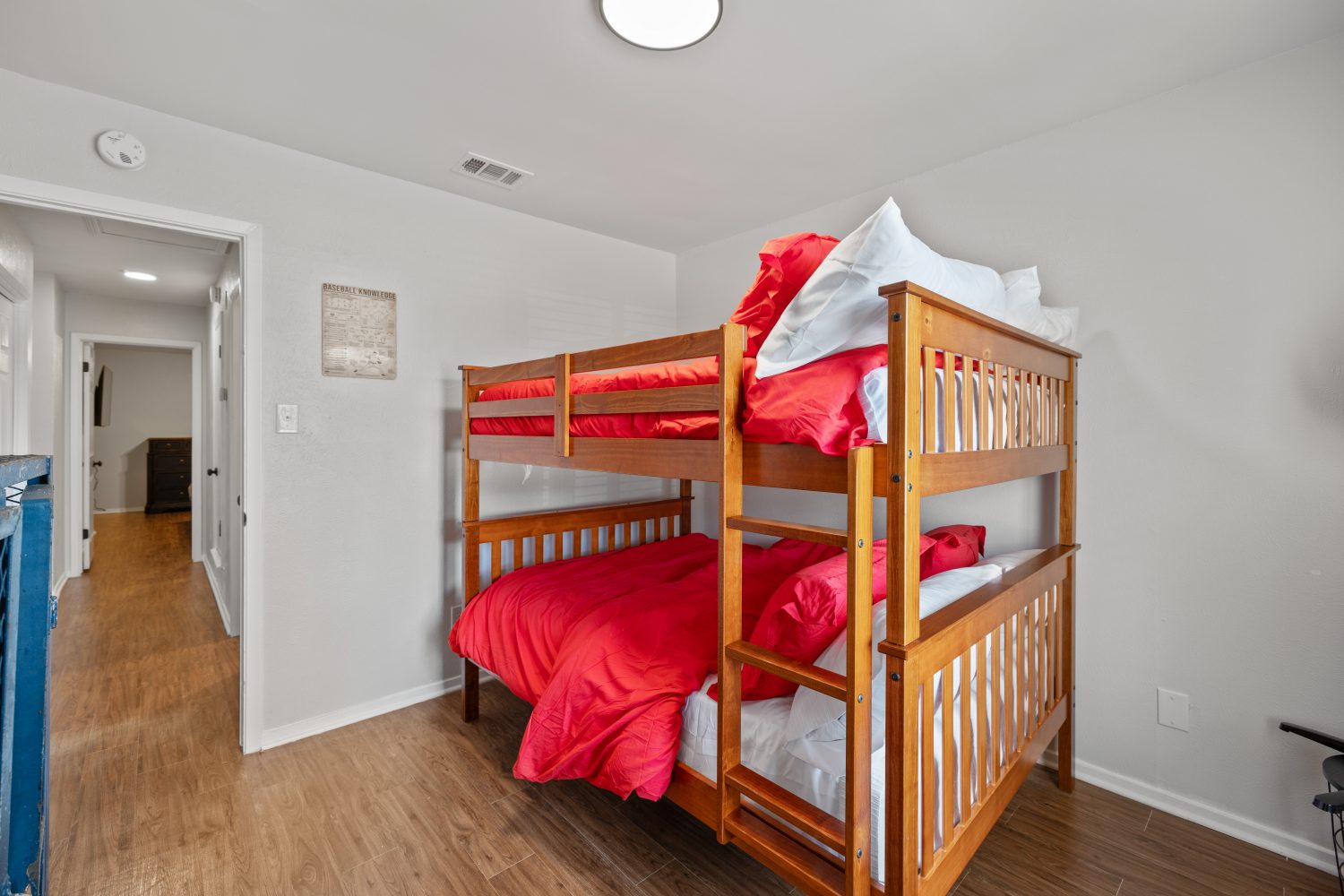 2 bed - 1 bath freshly remodeled unit. Master Bedroom includes a king size bed. Second Bedroom includes a full over full bunk bed. Small back patio. Surface parking lot with plenty of spaces. Fourplex backs up to a park.
