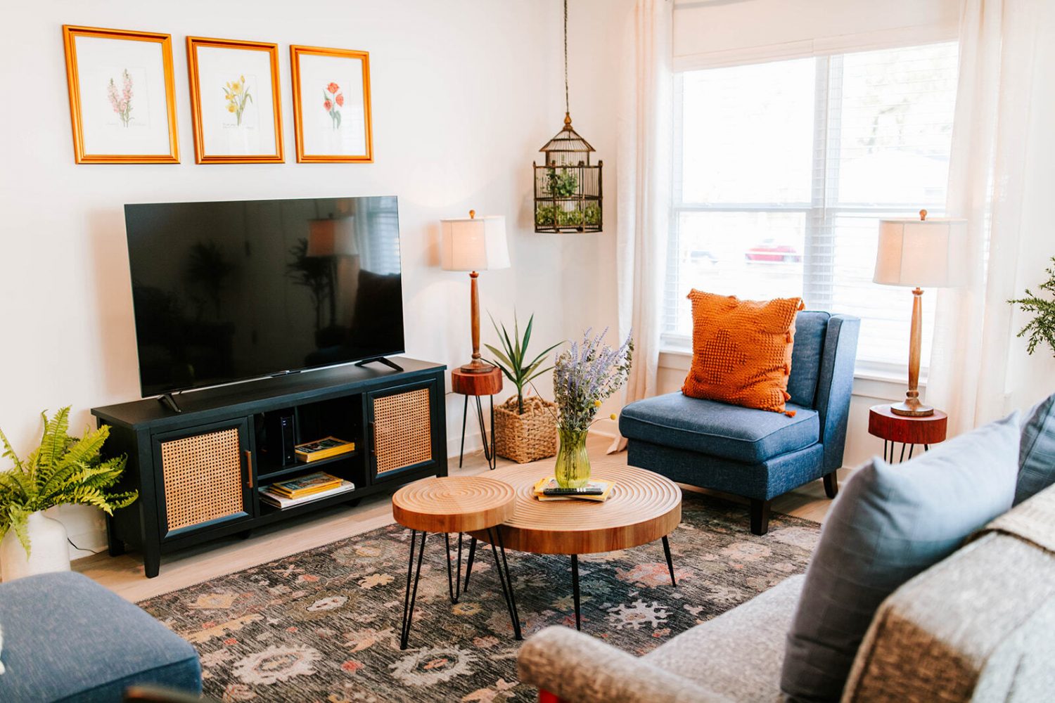 Our vibrant living area features a mid-century modern aesthetic with pops of burnt orange and deep navy. Stream your favorite movies on the smart TV or unwind on the tailored sofa and accent chairs. The open-concept layout seamlessly connects the lounge to the dining area, perfect for group conversations. Large windows fill the room with natural light, highlighting the unique wood-slab coffee tables and botanical art. Whether you are reading by the window or gathering for game night, this space offers a stylish, inviting retreat.