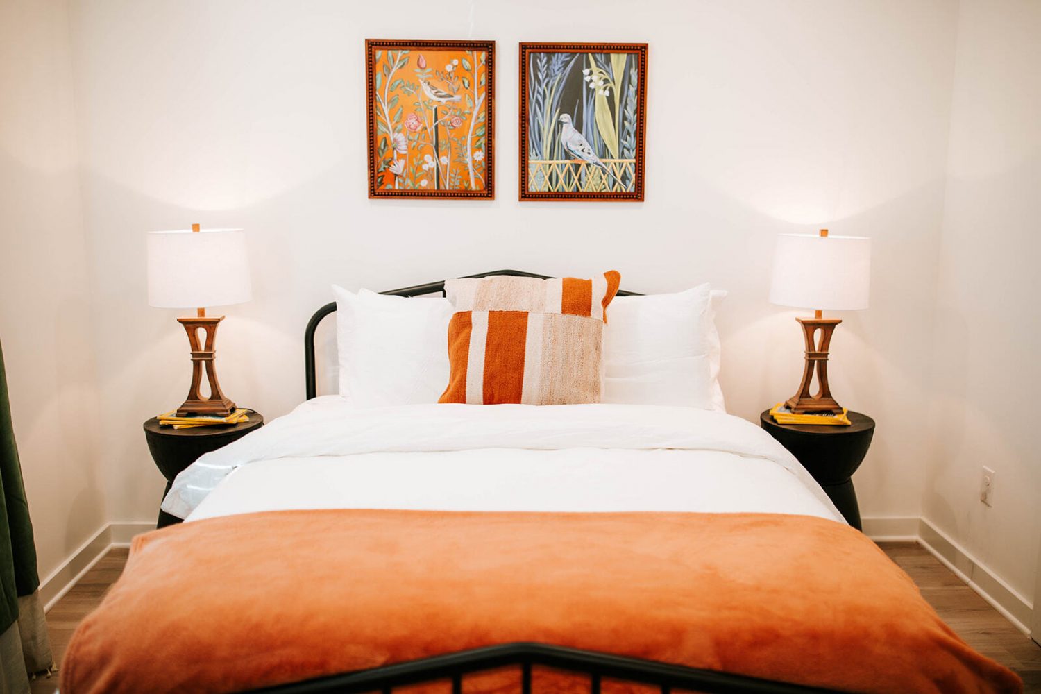 Retreat to a serene sanctuary designed for deep rest and rejuvenation. Our bedrooms feature plush queen beds topped with crisp white linens and soft, sunset-toned throws. You will find thoughtful touches throughout, from the ambient glow of amber glass lamps to the curated botanical artwork. Each room offers a unique personality, with mid-century-inspired nightstands and rich, patterned rugs underfoot. Whether you are catching up on sleep or enjoying a quiet moment of reflection, these rooms provide the perfect peaceful end to your day.
