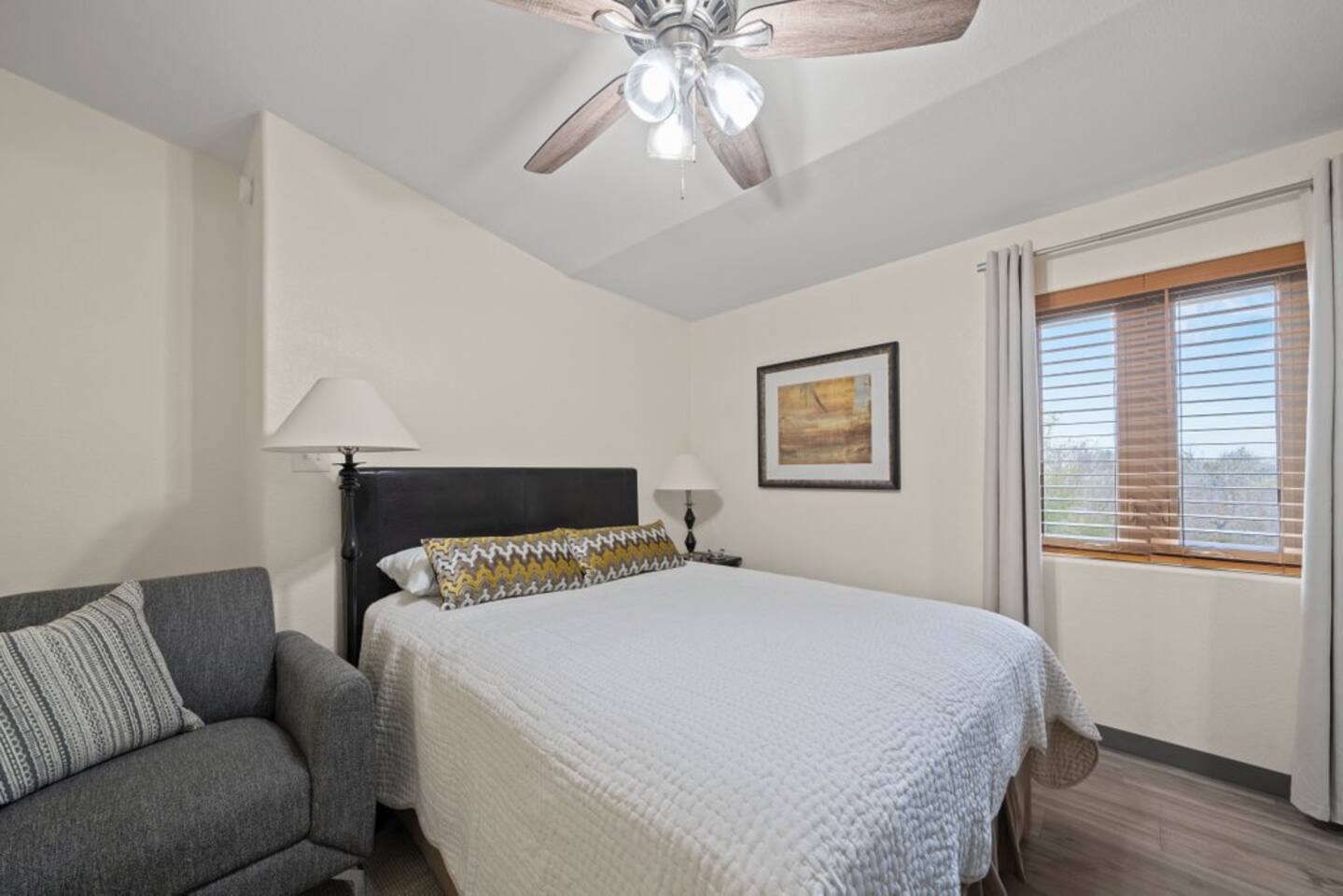 Beautiful, well-appointed, furnished 2-bedroom, 1-bath condo. The second story condo, at the highest point on our 50-acre property, overlooks a picturesque valley. The unit is 770 sq. ft, and designed for working people: black-out curtains, a kitchen with all the amenities, and an in-unit washer/dryer. It is a quiet, country setting, but close to many area attractions: 15 miles to Seguin & San Marcos, 20 miles to New Braunfels/Gruene.