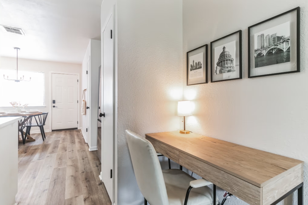 Workspace * Workspace setup includes a desk, a comfortable ergonomic chair, a lamp and a surge protector. Remote workers love the reliable and fast G-Fiber Wi-Fi!