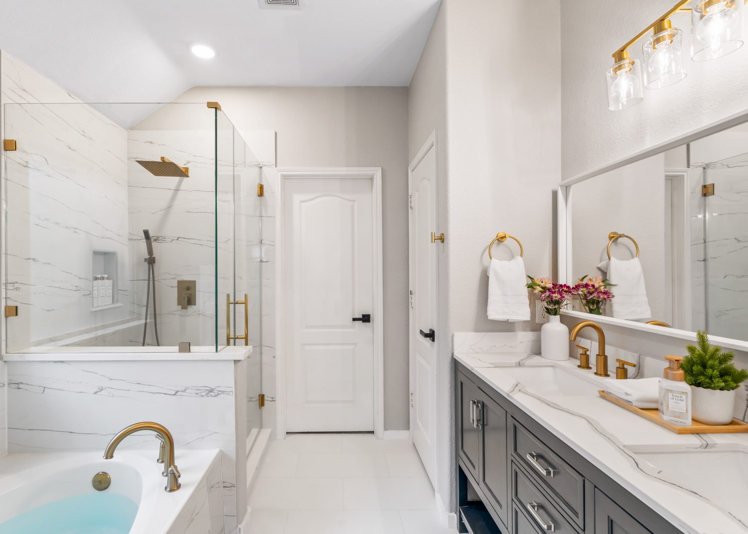 The primary suite offers a spa-like retreat with a standing shower and a jetted soaking tub, while the home includes a total of two full bathrooms for convenience.