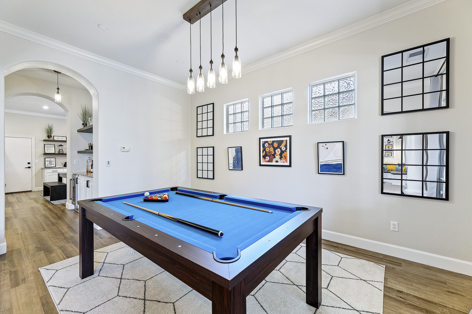 The house has a spacious shaded backyard with plenty of seating area. The backyard is perfect for relaxation and soaking in the sun and to let the kids (or adults) run around in the grass. The home has a Vegas-style lighting and standing bar top.
