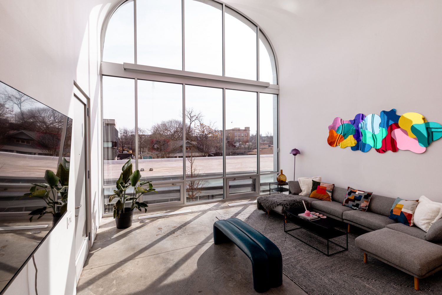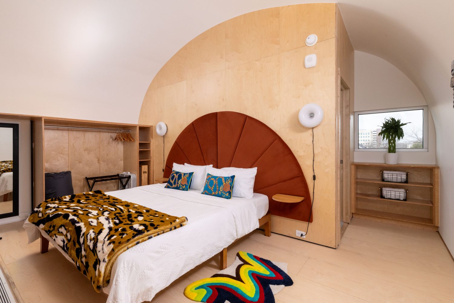 The bedroom is lofted with a gorgeous view and tons of natural light.