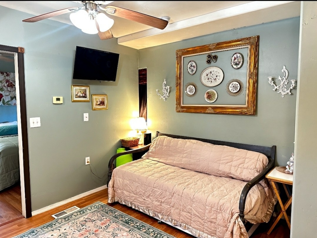 Flexible sleeping spaces for singles, couples, or small families. Queen bed sleeps 2. Twin daybed with twin pull out mattress sleeps additional 2.
