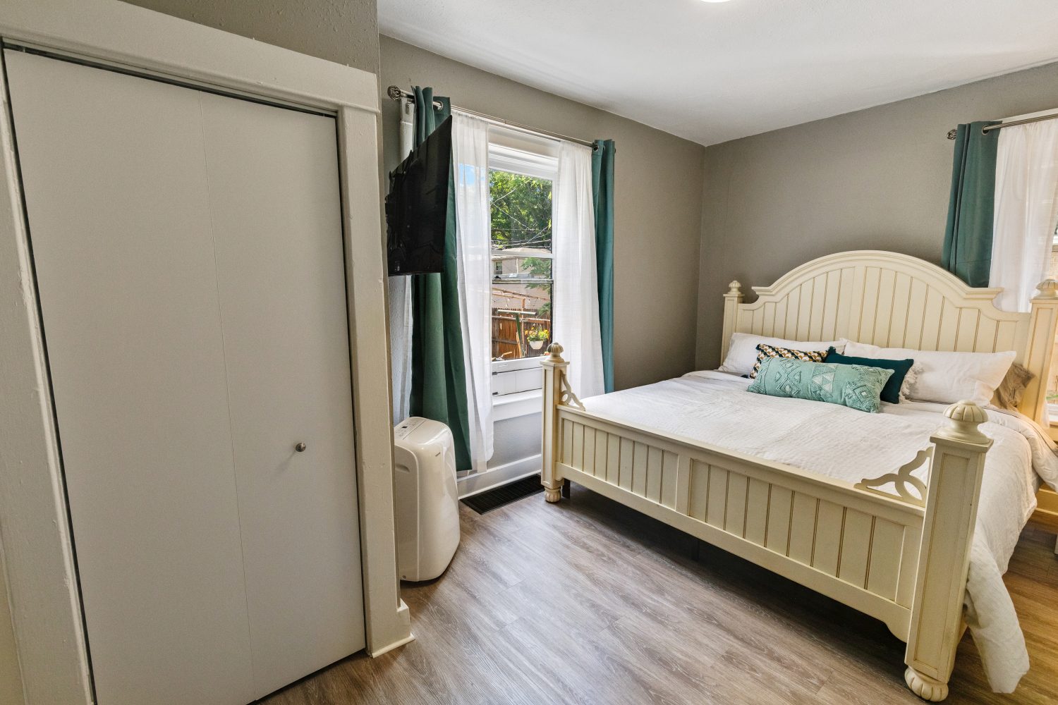 This fully-stocked one-bedroom unit from Elevated Furnished Rentals features a calming seashore theme, king bed, queen sleeper sofa in the living room, kitchen w/ sun room, onsite laundry...
