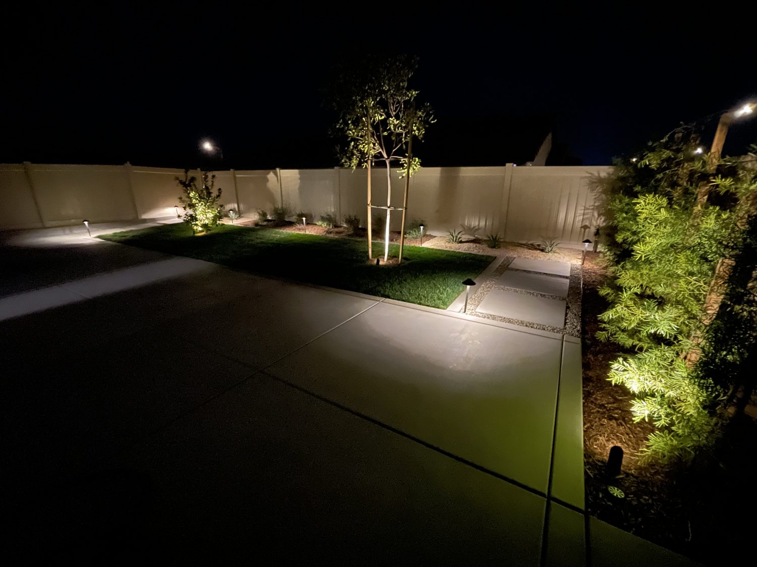 Landscape lighting backyard for trees and walk paths on auto timer.