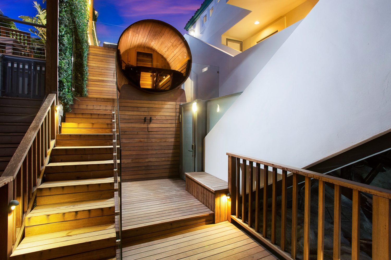 Behind private gates, a serene courtyard welcomes you with a panoramic ocean-view barrel sauna, a large jacuzzi, and multiple expansive outdoor living spaces. Two oversized decks overlook the Pacific, including a dramatic rooftop deck with a built-in fireplace—perfect for sunset gatherings and coastal entertaining.