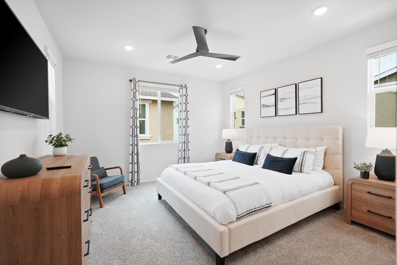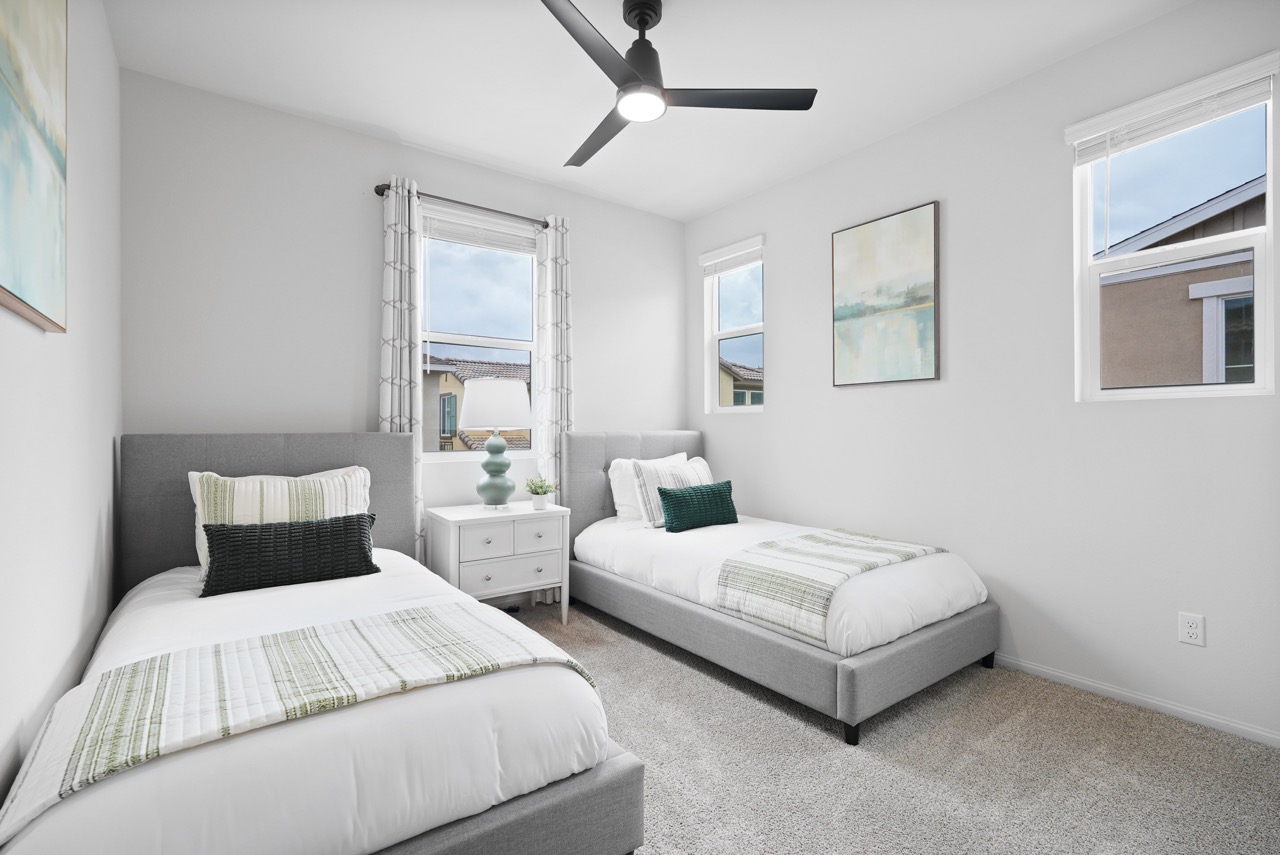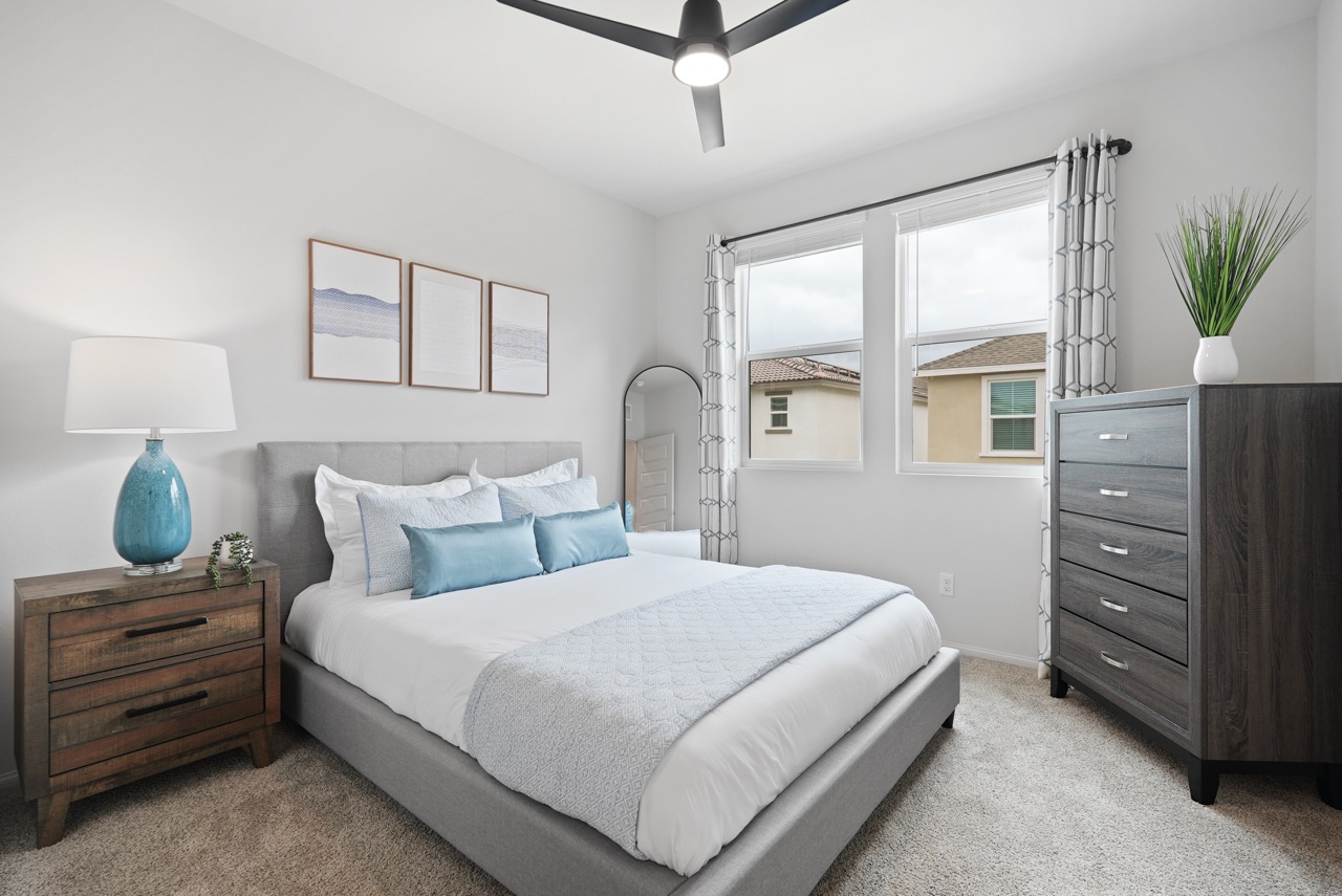 Each bedroom features high ceilings, ceiling fans, and window blinds throughout. The bedrooms also have hangers, dresser or chest, extra linens, extra pillows, and a hamper.