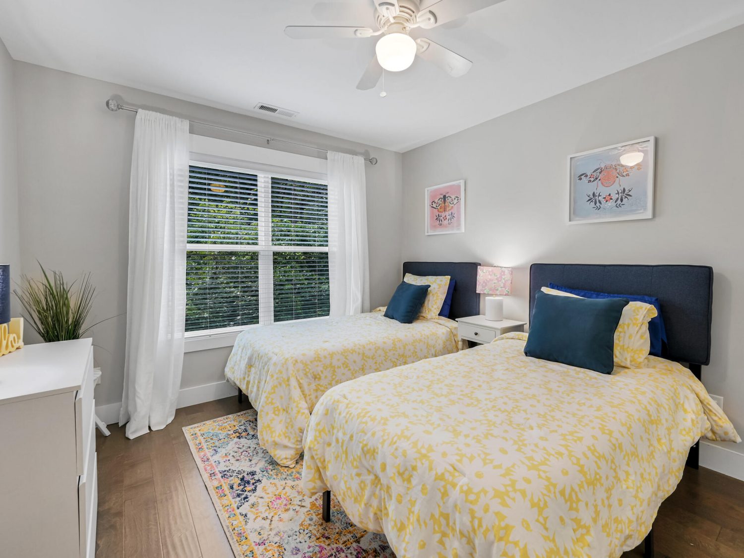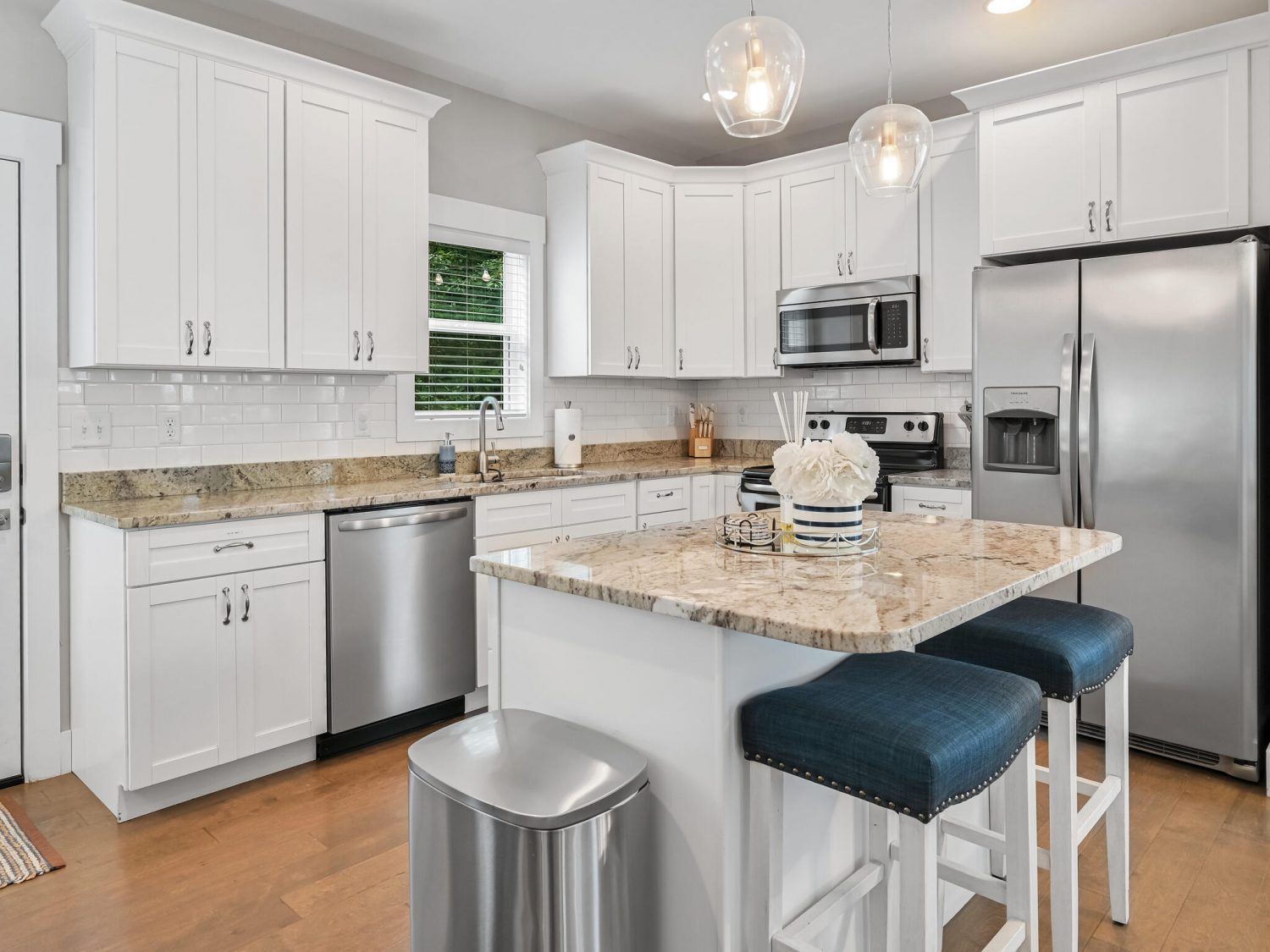 This charming two-story, fully furnished home features an open floor plan with beautiful hardwood floors throughout. It offers three spacious bedrooms: one with a king bed, another with a queen bed, and a third with two twin XL beds, all with plenty of closet space. Perfect for families, the home is infant-friendly with essential baby gear provided. The kids will love the cozy play area with a table, chair, books and toys. Outside, enjoy a cozy firepit area, a back deck with a gas grill and dining table, and a grassy yard ideal for kids' games. The driveway accommodates parking for two vehicles, making this home both convenient and inviting for your stay.