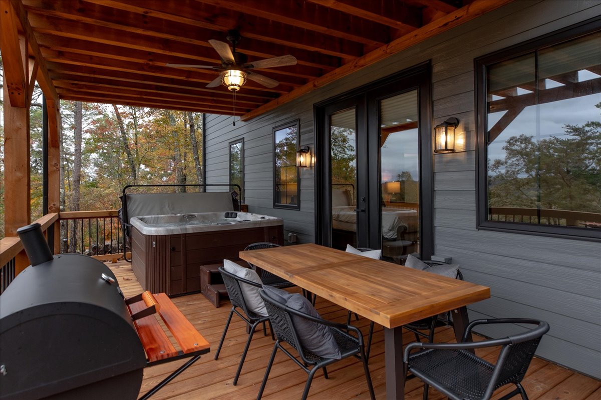 - Outdoor patio with Hot tub, Dining Table, & patio seating