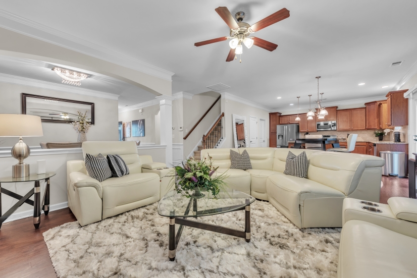 The open concept of this house has the main living room, dining room, bistro-style eating area, and kitchen in one large area to maximize the flow and entertainment opportunities. The living room features luxurious sofa seating and a large TV. You can also put a vinyl on the record player or use it as a Bluetooth speaker.