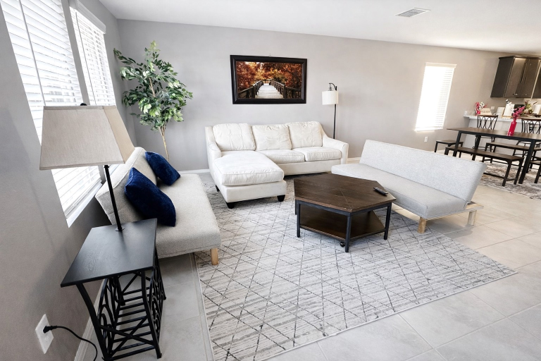 3 bed room, 2 bathrooms - single story home. Large backyard (fully fenced). All appliances included & FULLY FURNISHED. 2 Queen beds & 1 bunk bed (twin on top, full on bottom). 2 sofa beds. TV in living room & master bedroom. 1 Standing shower (master) & 1 shower/bathtub.