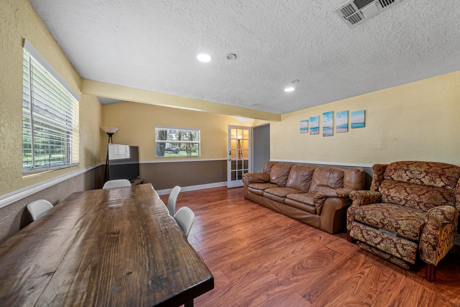 The residence is a single-story structure with multiple interior living areas, including a living room, dining area, kitchen, and additional seating spaces designed to accommodate groups comfortably. The home has central air conditioning and standard residential utilities.