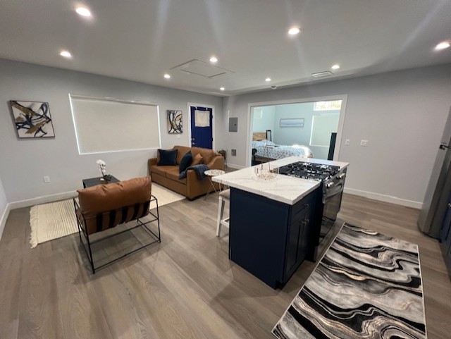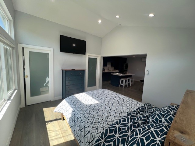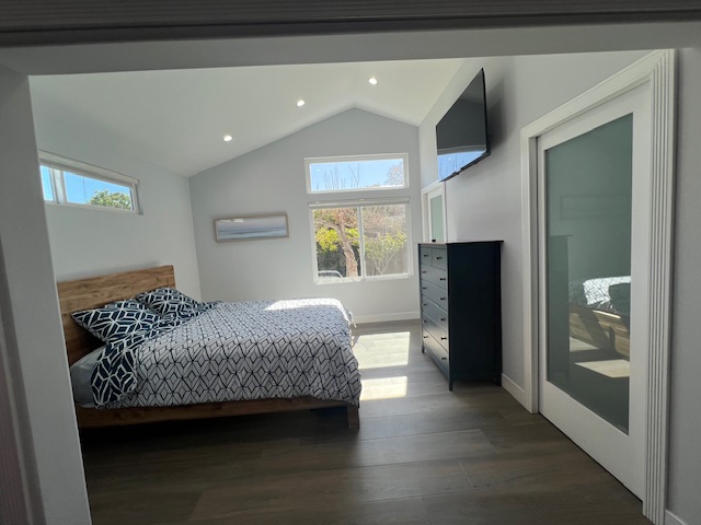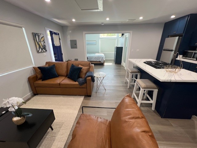 Contemporary 1bdrm ADU with private entrance situated in the heart of Baldwin Hills with an open floor plan and modern appliances. The bedroom features a queen size bed while the living area provides additional sleeping options with a queen size sleeper sofa.