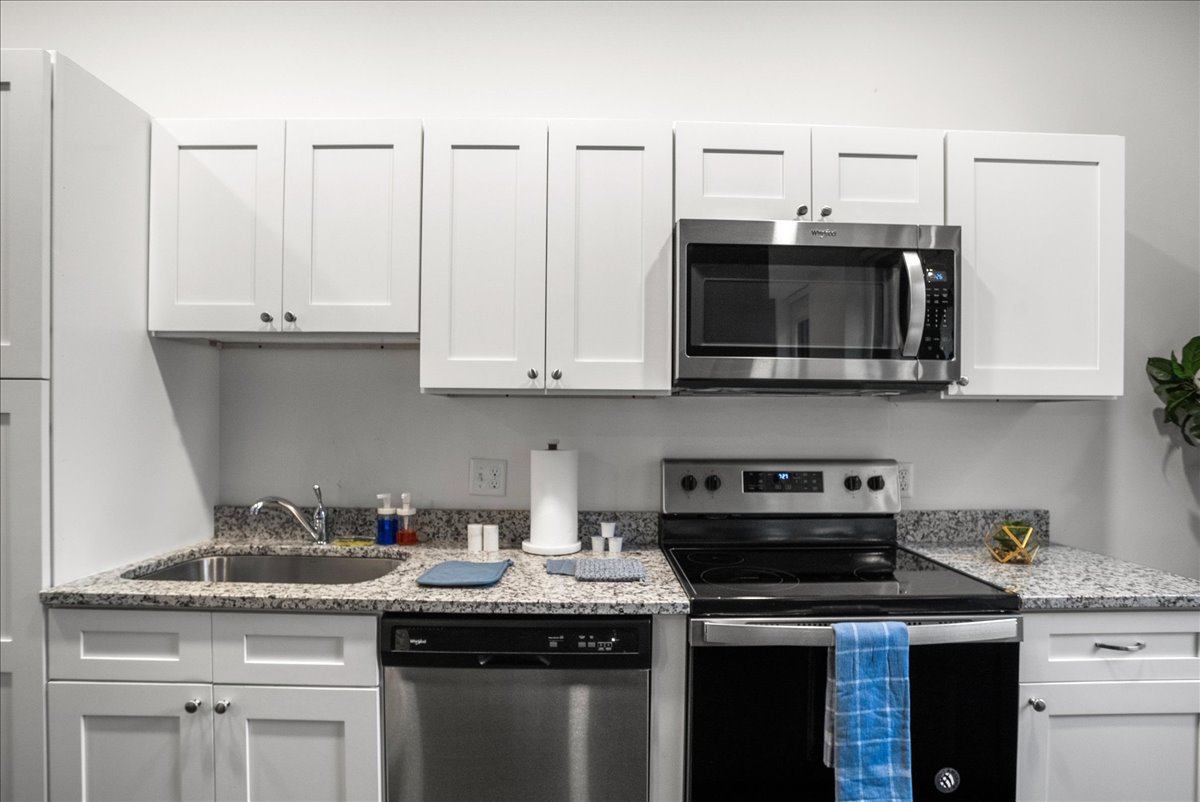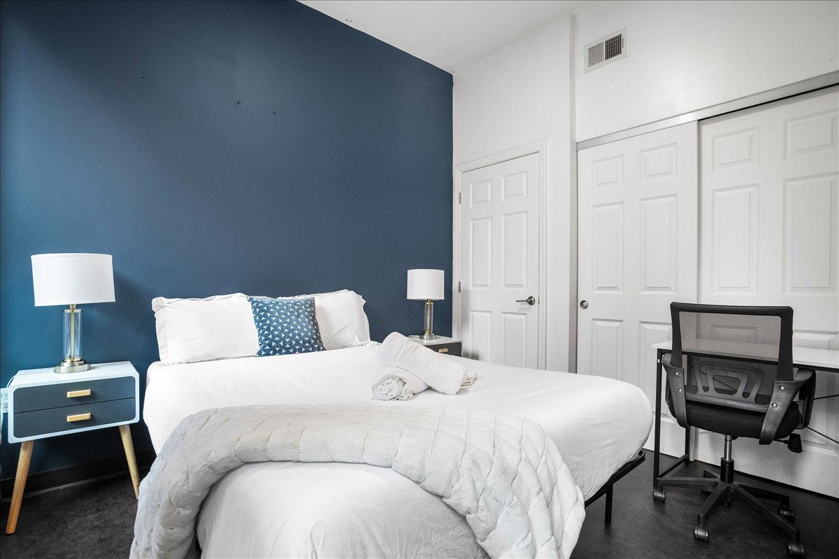 This inviting apartment is your perfect retreat after a day of exploring the city. The living space is designed for relaxation and convenience, featuring a 55" Smart TV for entertainment and a workspace complete with a table and chair for those needing to get some work done during their stay. The stackable washer and dryer unit facilitates laundry needs, allowing for a hassle-free experience as you settle into your temporary home.