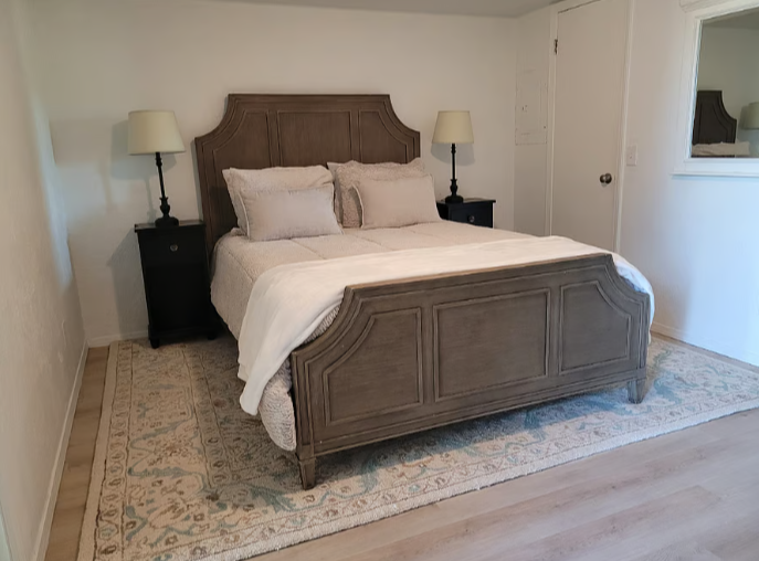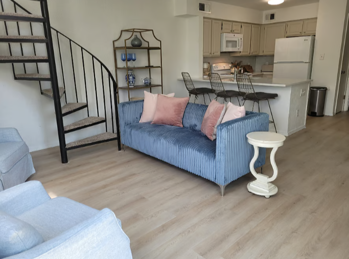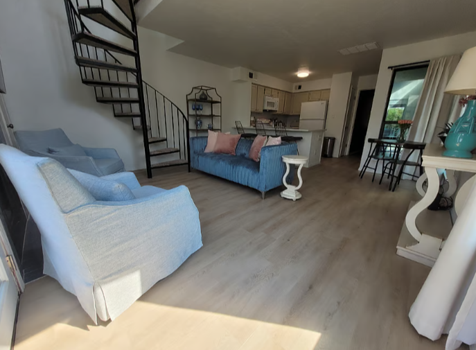 Cozy 1bd/1ba fully furnished second-story loft condo comes with everything you need to start off your stay. The new queen bed has luxury 100% cotton bedding. The loft has an egg chair for reading, a desk for working, and free weights and a yoga mat for exercising. Other amenities include pool towels, a portable Bluetooth speaker, air fryer, Keurig as well as a 12-cup coffee maker, and slow cooker.