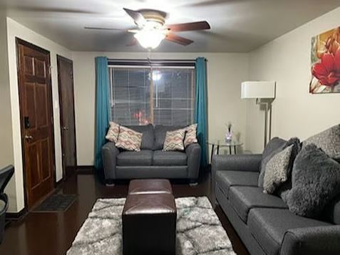 Cozy 2bd/1ba fully furnished unit with ample closet space. Cozy bathroom with jacuzzi tub, Well equipped kitchen with dining area, Relaxing living room. Office nook in living room and second bedroom. Laundry facility located in the basement via enclosed stairway. Located in a quiet walkable neighborhood with parking at premise.